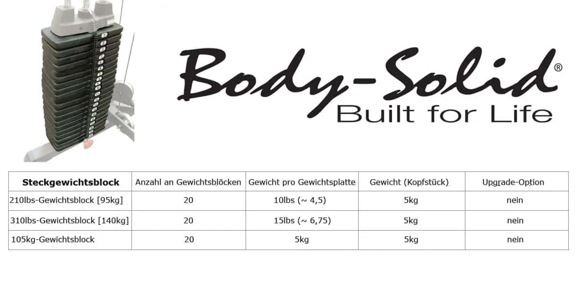 Standardmäßig ist das Gerät mit vier Gewichtstürmen à 95kg (210lbs) ausgestattet. Im Lieferumfang enthalten sind außerdem: Latzugstange, Curlstange, Bauchgurt, Fußschlaufe und zwei Kabelgriffe.