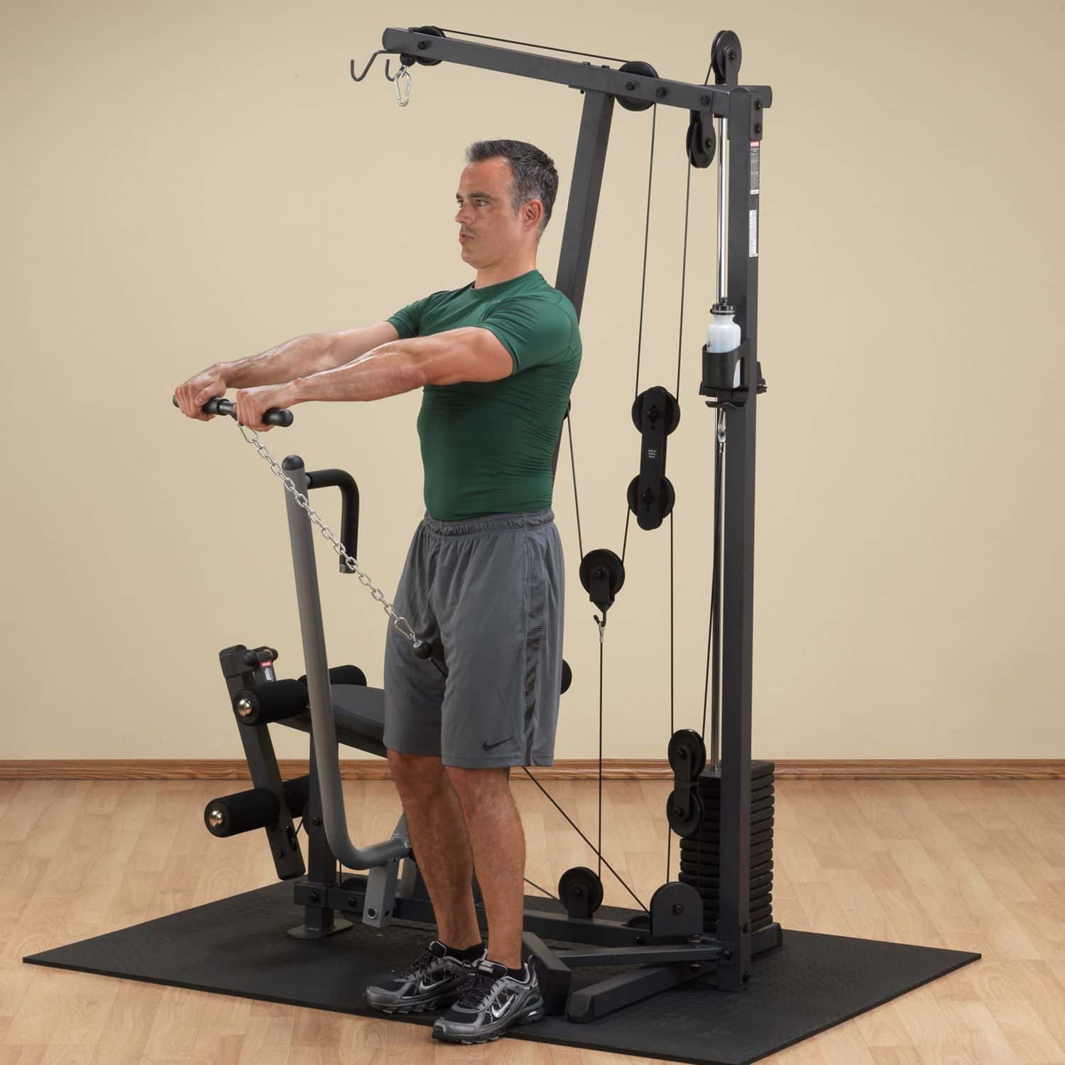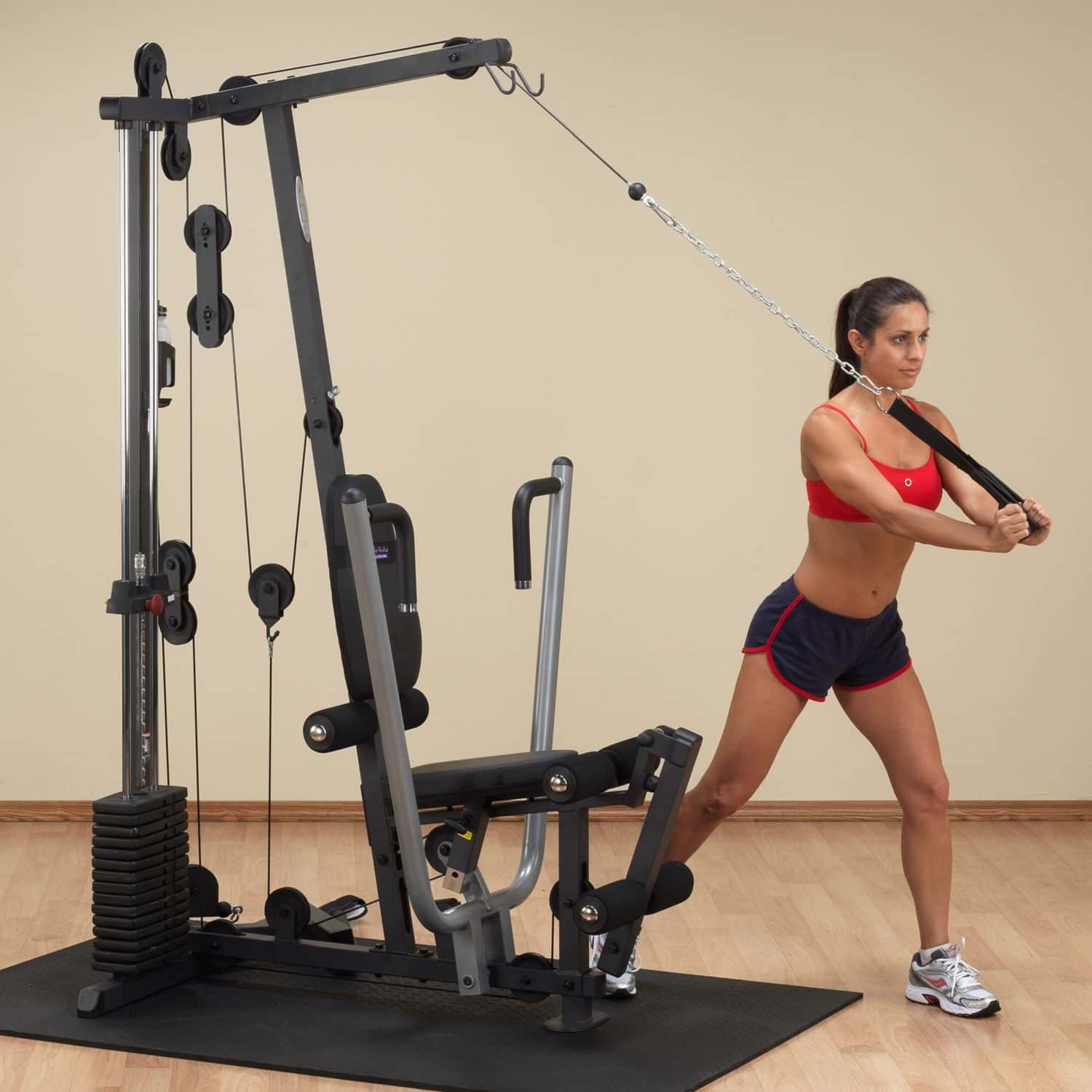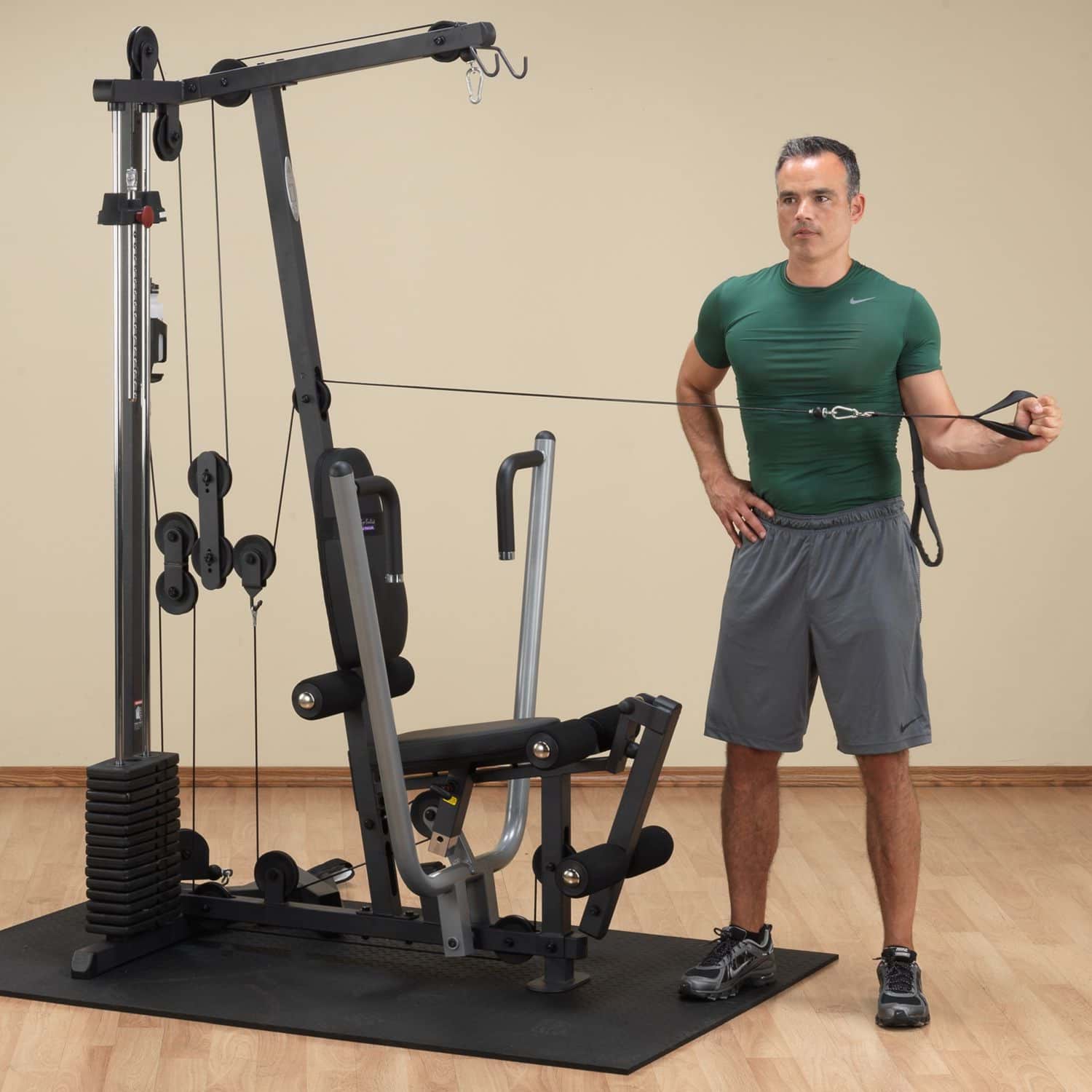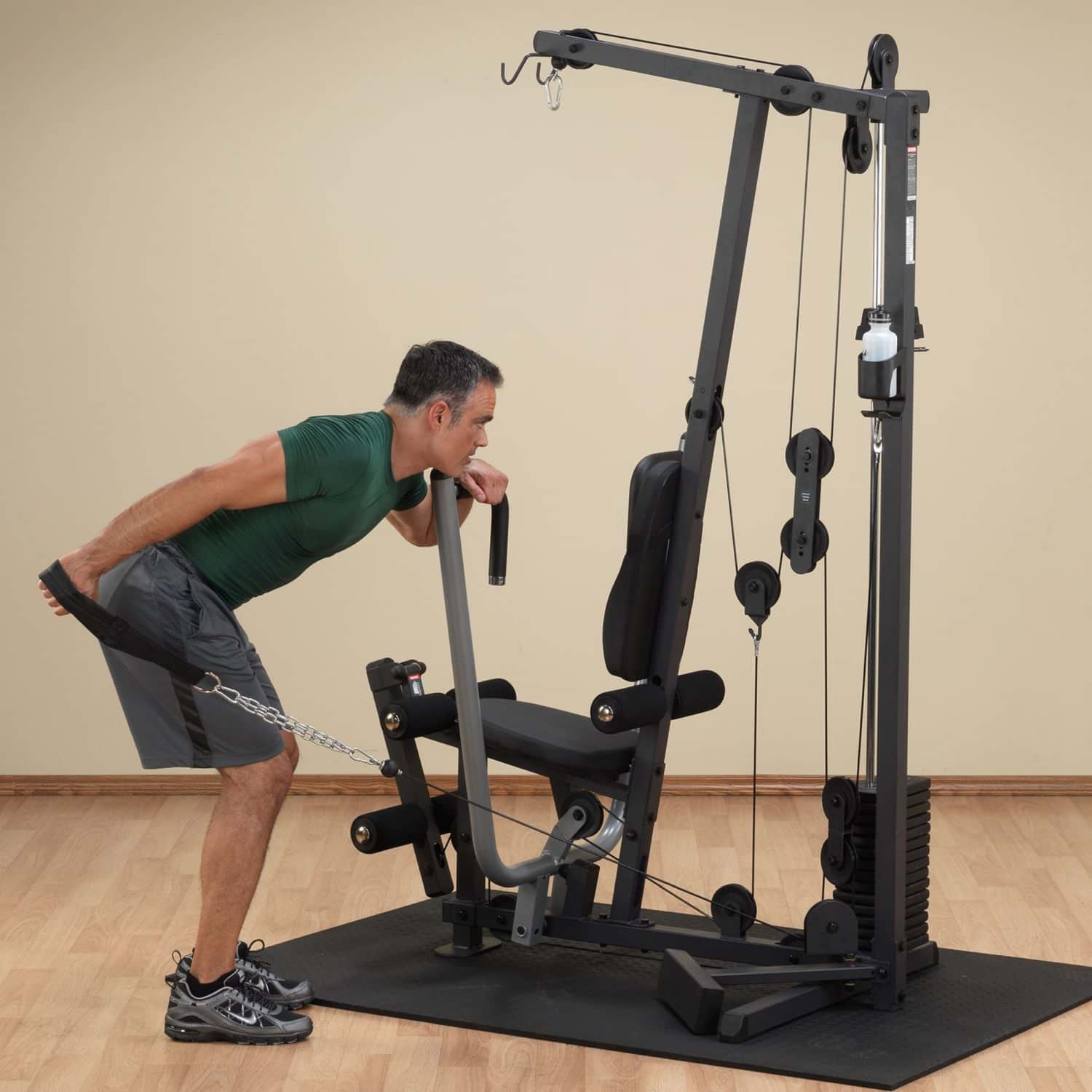 Die Ganzkörpertrainer aus der Body-Solid G-Serie werden nach den höchsten Fertigungsstandards und unter Verwendung der hochwertigsten Umlenkrollen, Kabel und Polsterungen hergestellt. Das platzsparende Design des G-1S ist das perfekte Einsteigermodell und verfügt über einen selektiven 72kg-Gewichtsblock sowie drei Zug-Vorrichtungen auf unterschiedlichen Höhen, die dem Nutzer eine Vielzahl von Übungen ermöglichen. Dabei ist der Multi-Grip-Pressarm biomechanisch für eine maximale Brustkontraktion und somit für eine hervorragende Muskelentwicklung ausgelegt. Das per Pop-Pin mehrfach höhenverstellbare Sitzpolster kann schnell und einfach auf jede Körpergröße eingestellt werden und sorgt während des Trainings für eine korrekte Körperpositionierung. Wartungsfreie, kugelgelagerte Umlenkrollen sowie ein nylonummanteltes Stahlseil aus dem Flugzeugbau garantieren einen friktionsfreien Bewegungsablauf bei jeder Übungseinheit.