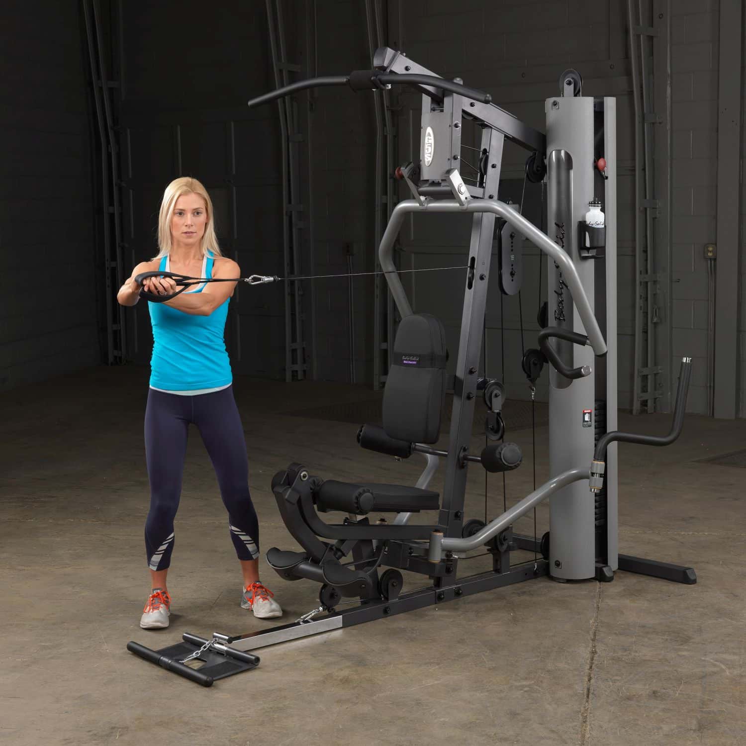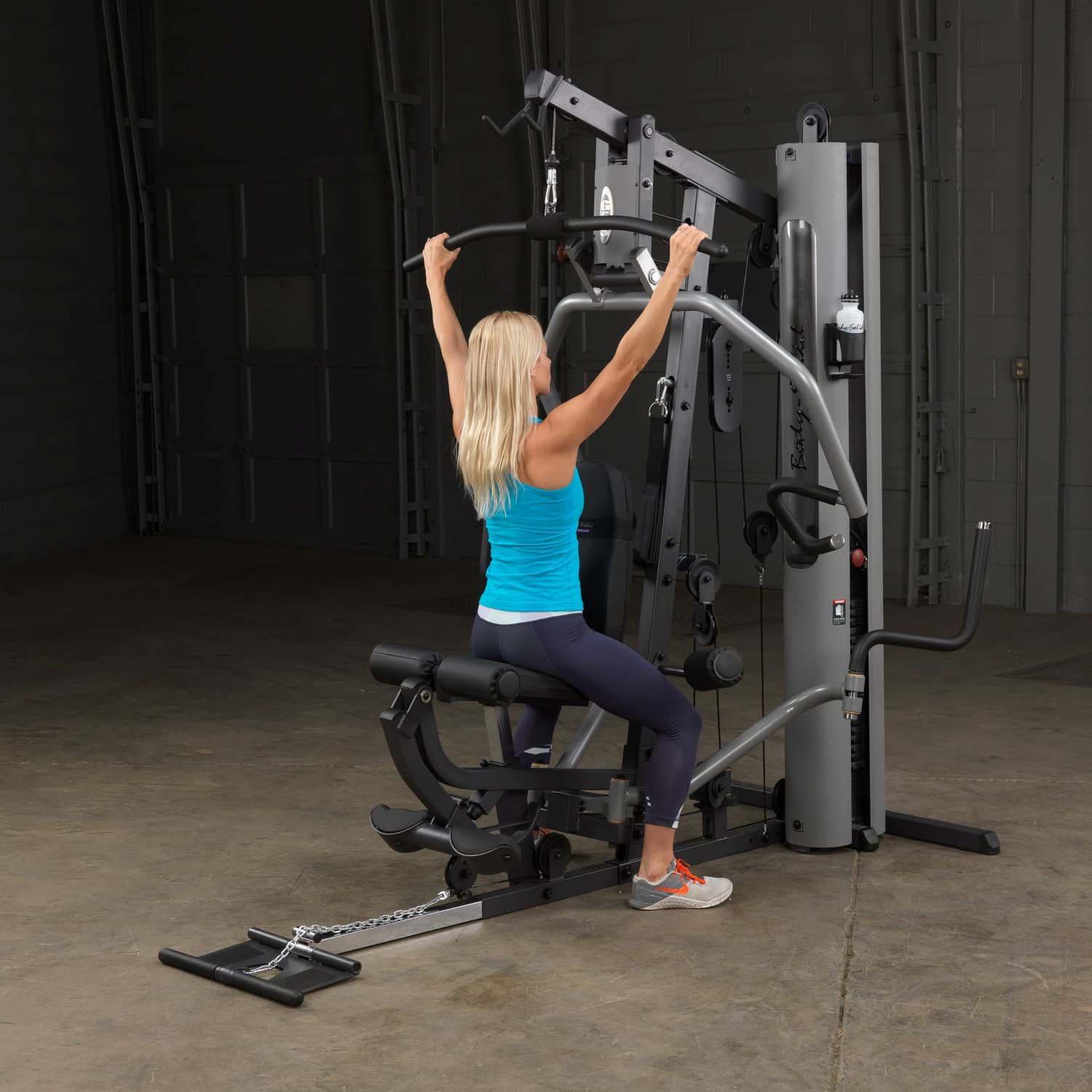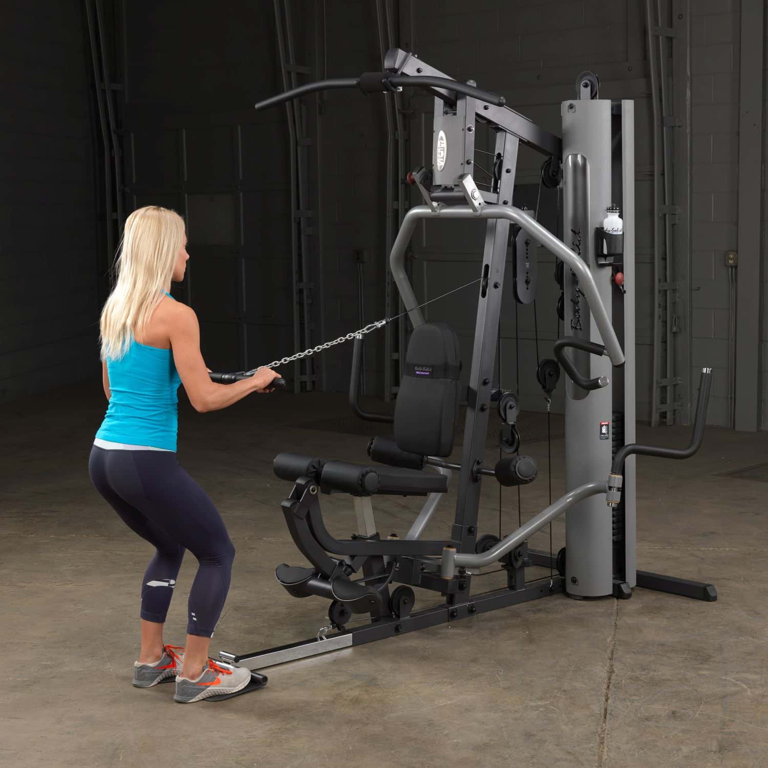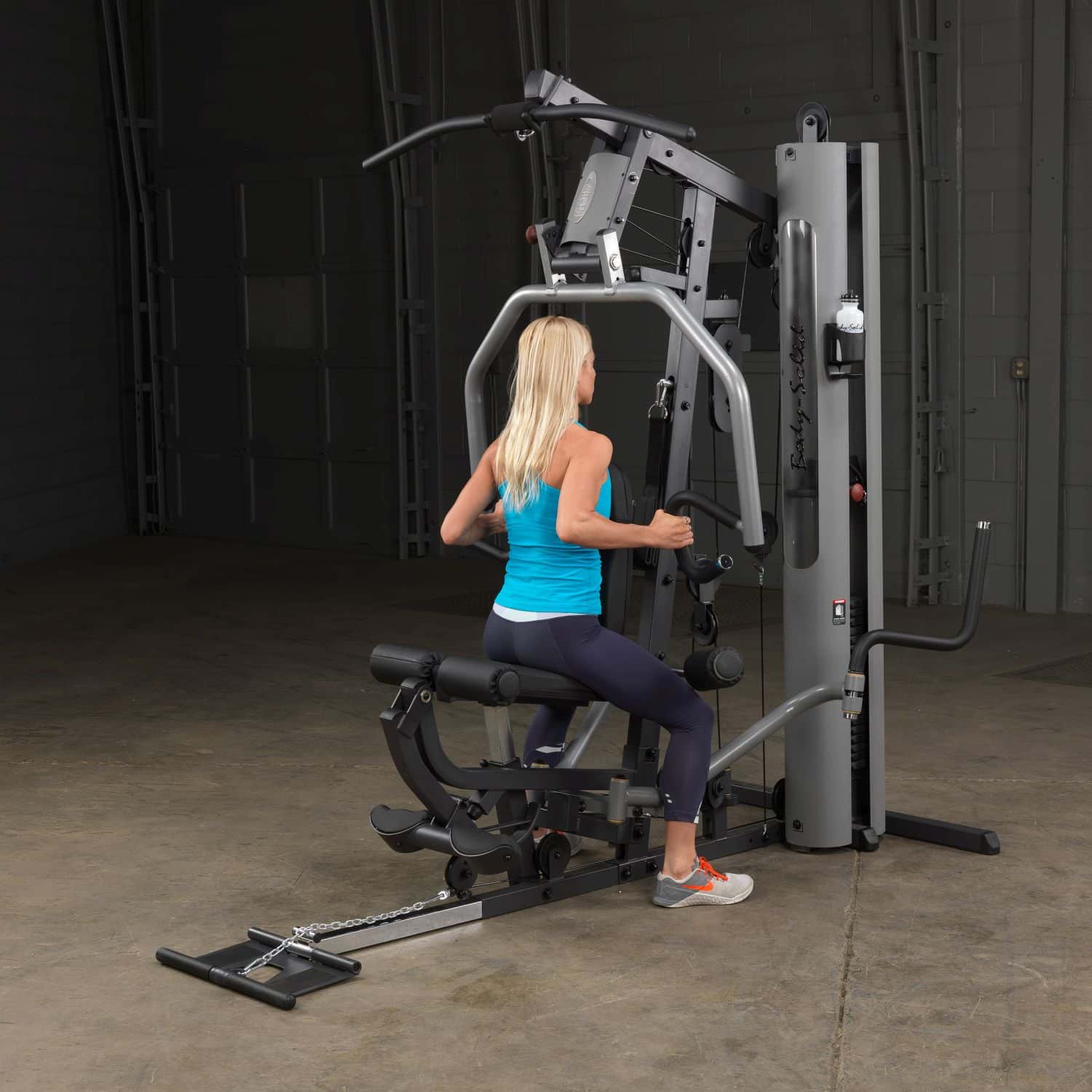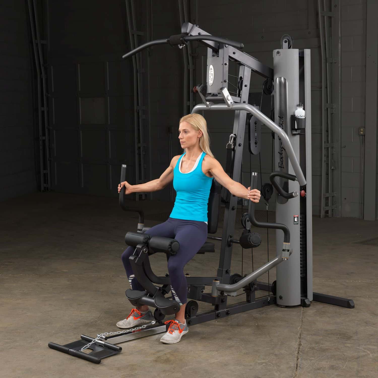 Der Body-Solid Ganzkörpertrainer aus der G-Serie hilft Ihnen dabei Ihre gesamte Körpermuskulatur zu trainieren. Dank der parallelen Drückerarme mit Multipositionsgriffen wird eine tiefe und effektive Muskelkontraktion bei Brust-, Schrägbank- und Schulterübungen gewährleisten. Darüber hinaus müssen Ruderübungen nicht mehr auf dem Boden sitzend durchgeführt werden, sondern können ganz bequem verkehrt herum auf dem Sitzpolster sitzend am breiten Drückerbügel ausgeführt werden. Das per Pop-Pin höhenverstellbare sowie im Neigungswinkel verstellbare Rückenpolster mit Lendenwirbelstütze und das gasdruckunterstütze Sitzpolster lassen dabei eine schnelle und einfache Anpassung an jeden Nutzer zu und stellen zudem eine korrekte Trainingsposition sicher. Um das Übungsspektrum beim Rudern weiter zu erhöhen, kann die klappbare Fußstütze aufgerichtet werden, um so die nötige Stabilität während der Übungsdurchführung zu erhalten. Die selbstausrichtende, anatomisch geformten Beinstrecker-Polster passen sich automatisch dem Bewegungsablauf an, sodass ein präzises Training des Beinstreckers möglich ist. Zum guten Schluss vervollständigen Butterflyarme mit unterschiedlichen Startpositionen und die obere Kabelzug-Vorrichtung das Ganzkörpertraining im Ihrem Heimstudio.