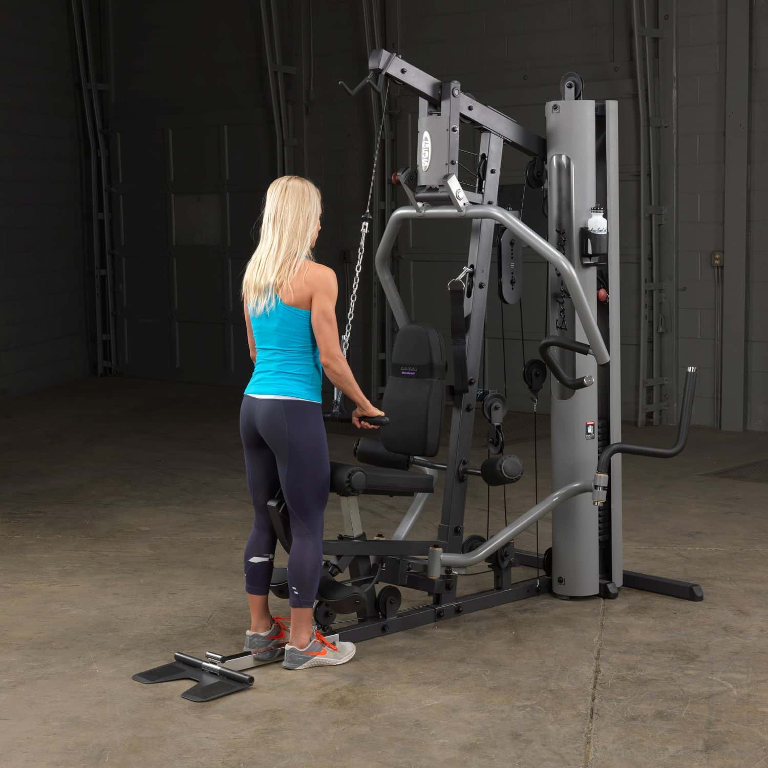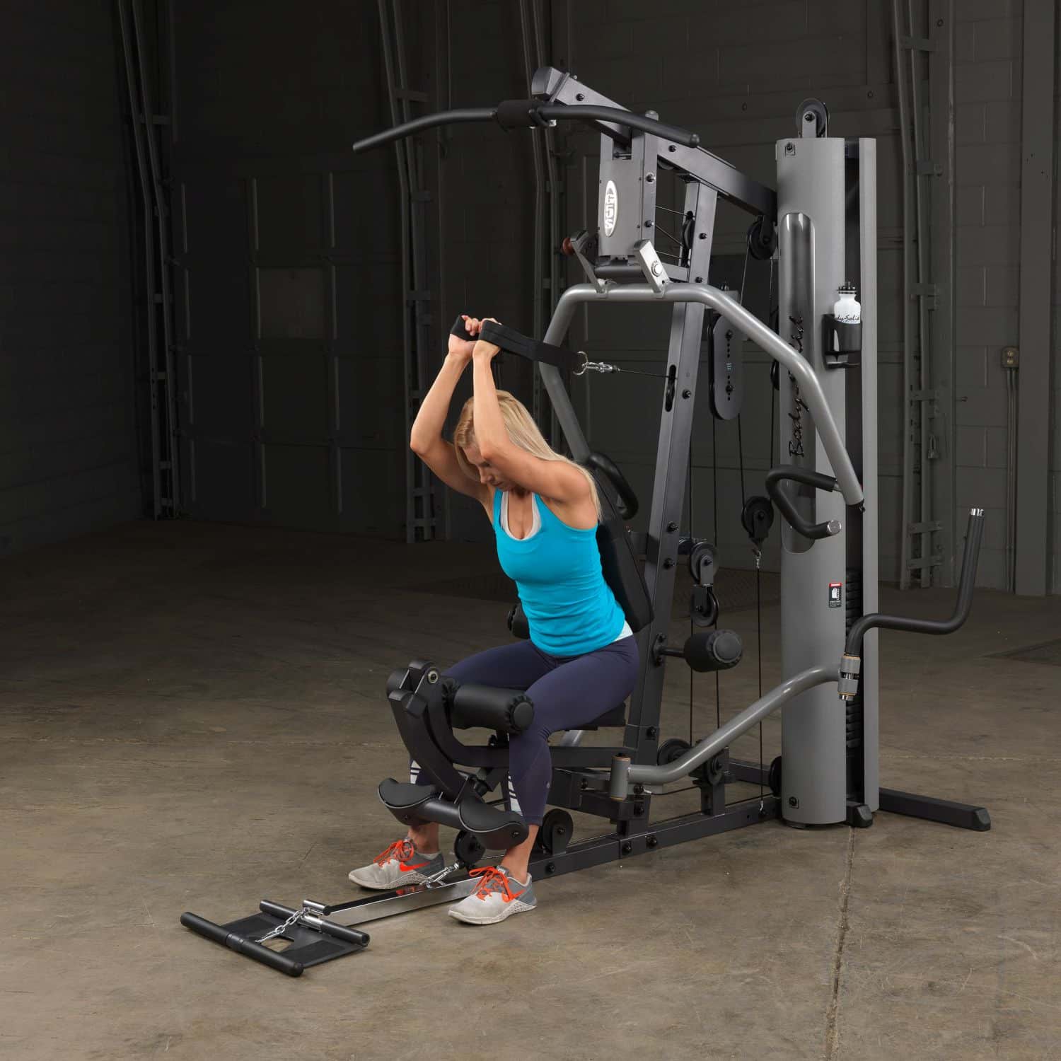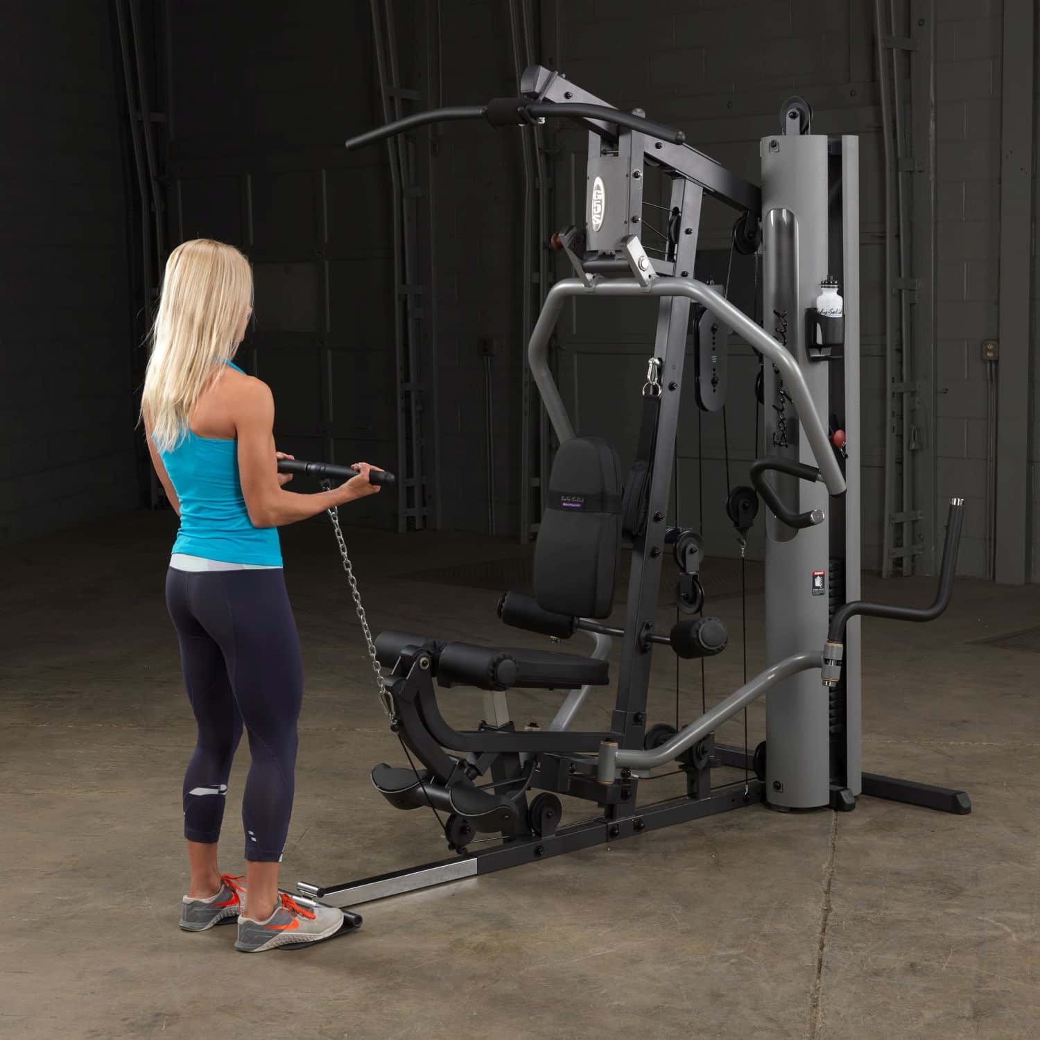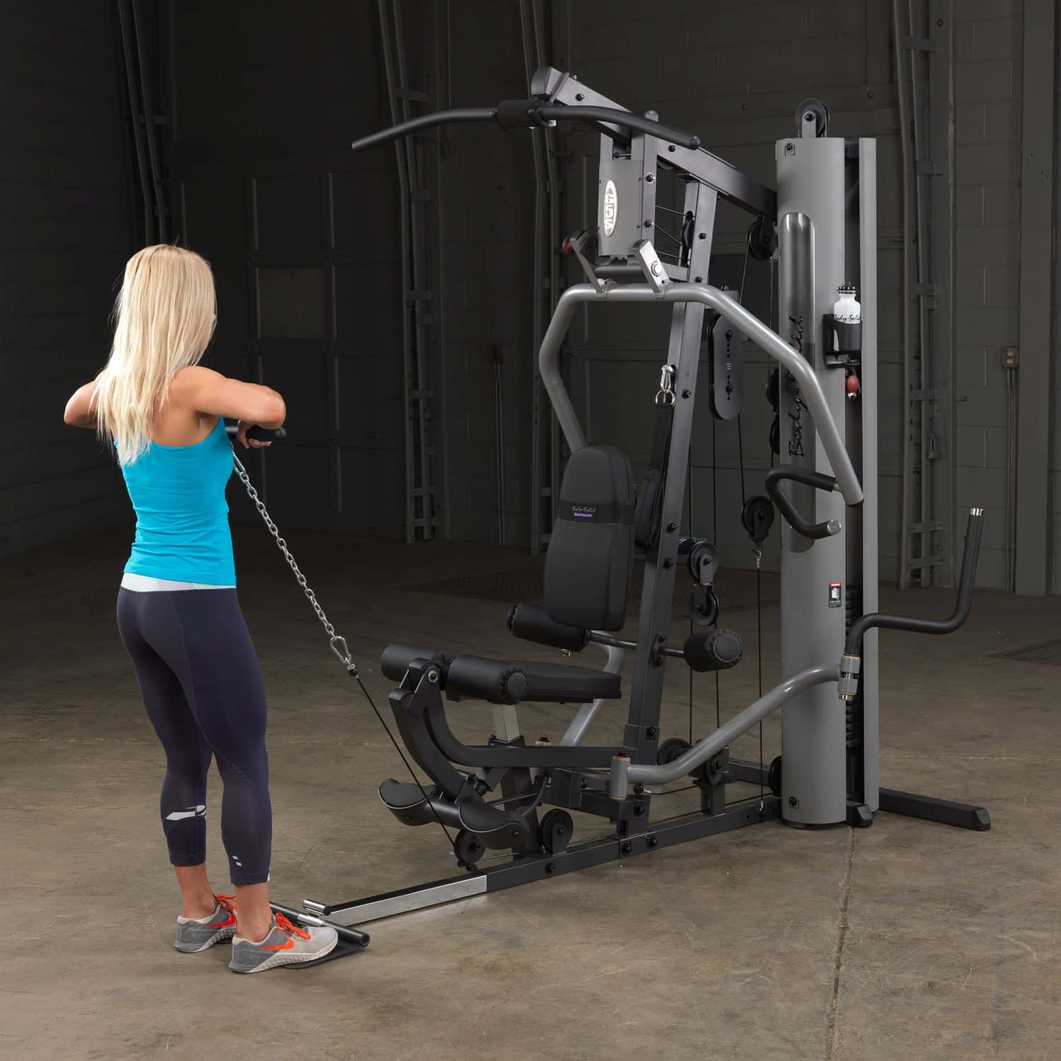 Der Body-Solid Ganzkörpertrainer aus der G-Serie hilft Ihnen dabei Ihre gesamte Körpermuskulatur zu trainieren. Dank der parallelen Drückerarme mit Multipositionsgriffen wird eine tiefe und effektive Muskelkontraktion bei Brust-, Schrägbank- und Schulterübungen gewährleisten. Darüber hinaus müssen Ruderübungen nicht mehr auf dem Boden sitzend durchgeführt werden, sondern können ganz bequem verkehrt herum auf dem Sitzpolster sitzend am breiten Drückerbügel ausgeführt werden. Das per Pop-Pin höhenverstellbare sowie im Neigungswinkel verstellbare Rückenpolster mit Lendenwirbelstütze und das gasdruckunterstütze Sitzpolster lassen dabei eine schnelle und einfache Anpassung an jeden Nutzer zu und stellen zudem eine korrekte Trainingsposition sicher. Um das Übungsspektrum beim Rudern weiter zu erhöhen, kann die klappbare Fußstütze aufgerichtet werden, um so die nötige Stabilität während der Übungsdurchführung zu erhalten. Die selbstausrichtende, anatomisch geformten Beinstrecker-Polster passen sich automatisch dem Bewegungsablauf an, sodass ein präzises Training des Beinstreckers möglich ist. Zum guten Schluss vervollständigen Butterflyarme mit unterschiedlichen Startpositionen und die obere Kabelzug-Vorrichtung das Ganzkörpertraining im Ihrem Heimstudio.