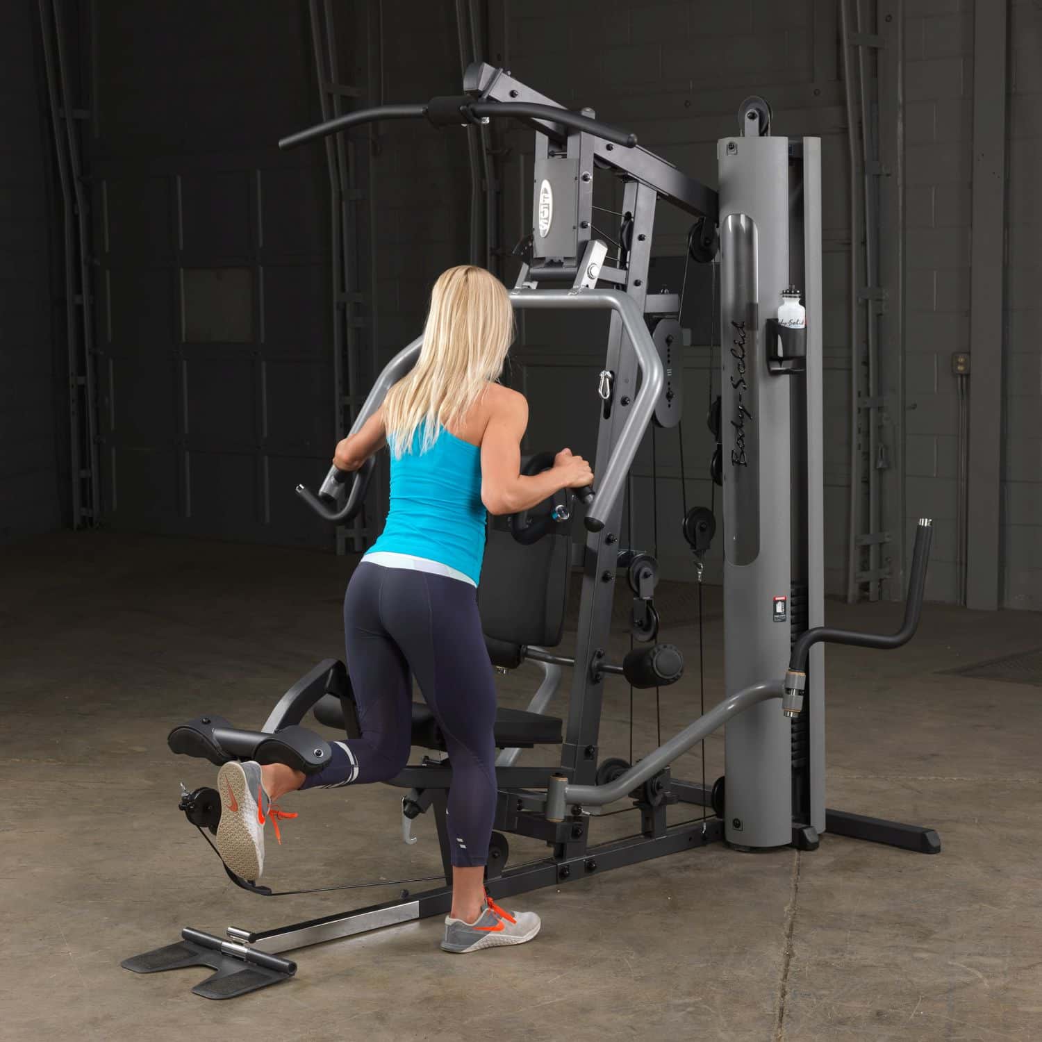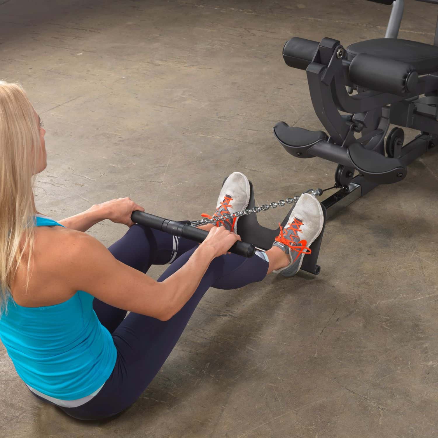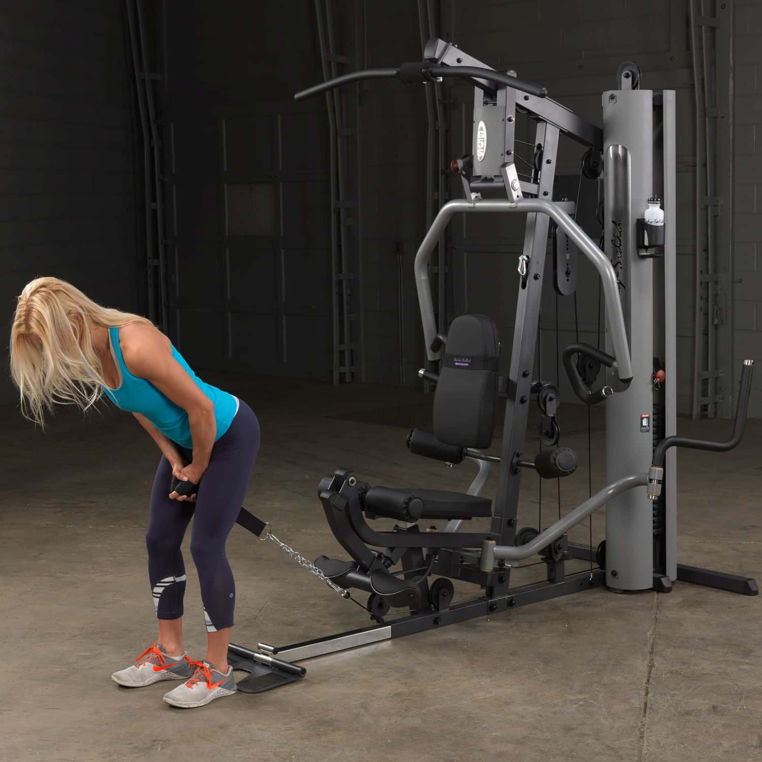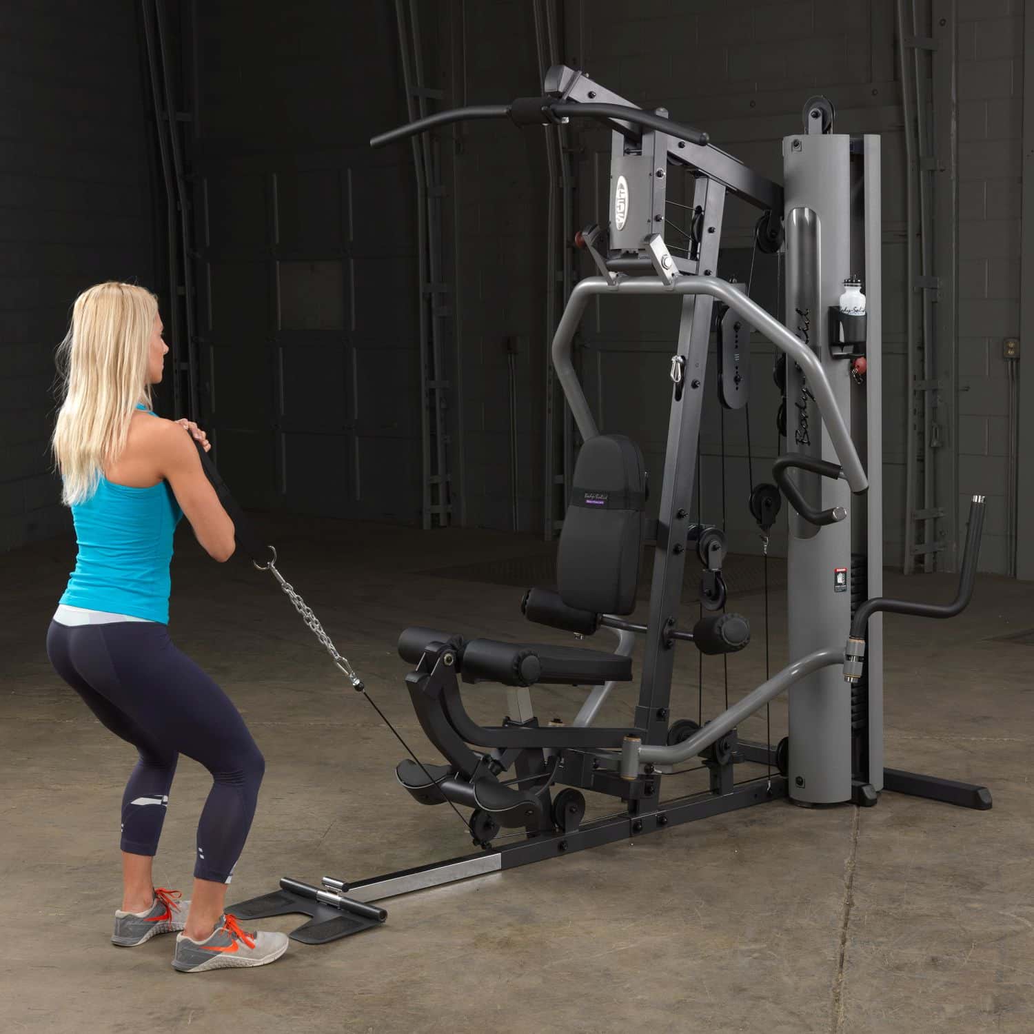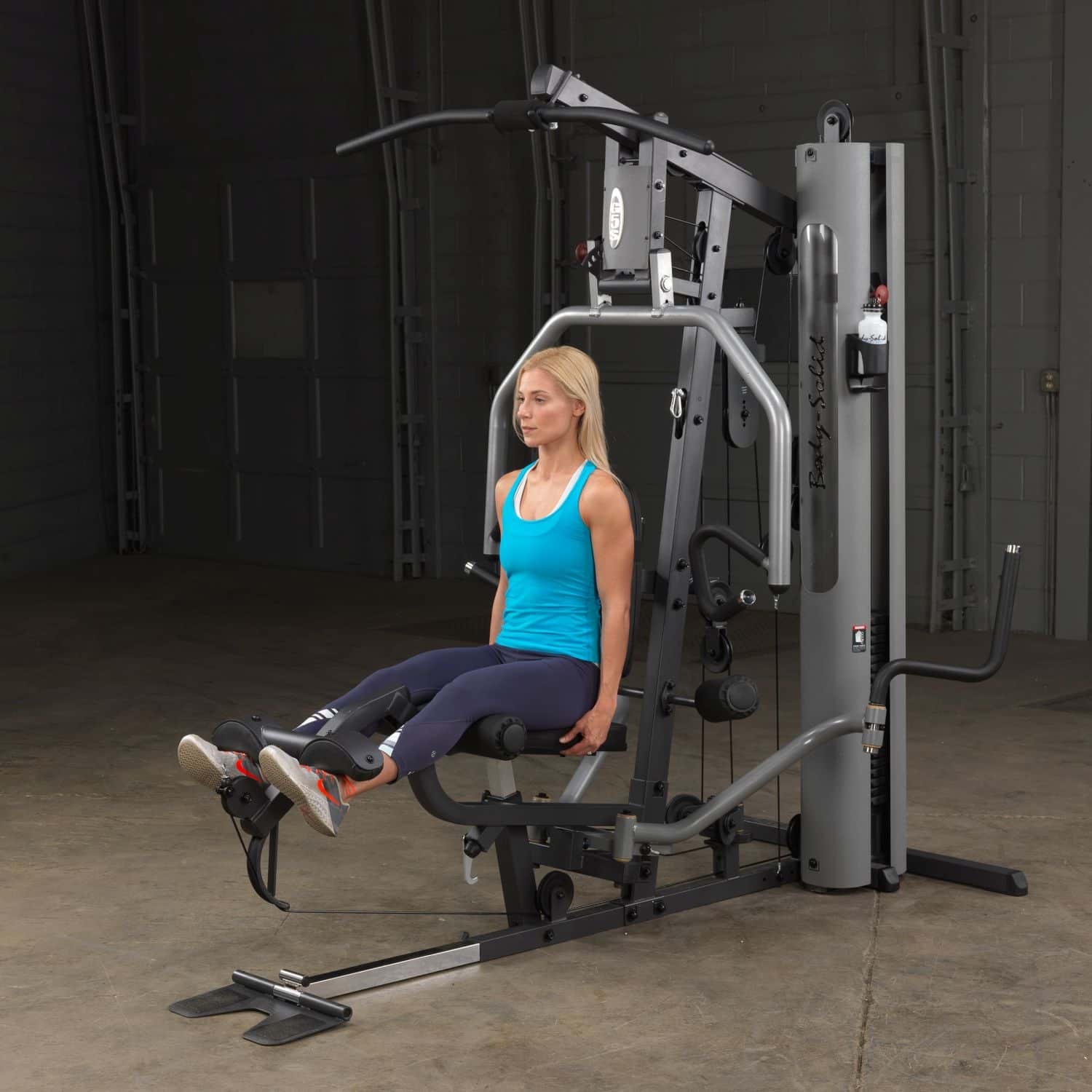 Der Body-Solid Ganzkörpertrainer aus der G-Serie hilft Ihnen dabei Ihre gesamte Körpermuskulatur zu trainieren. Dank der parallelen Drückerarme mit Multipositionsgriffen wird eine tiefe und effektive Muskelkontraktion bei Brust-, Schrägbank- und Schulterübungen gewährleisten. Darüber hinaus müssen Ruderübungen nicht mehr auf dem Boden sitzend durchgeführt werden, sondern können ganz bequem verkehrt herum auf dem Sitzpolster sitzend am breiten Drückerbügel ausgeführt werden. Das per Pop-Pin höhenverstellbare sowie im Neigungswinkel verstellbare Rückenpolster mit Lendenwirbelstütze und das gasdruckunterstütze Sitzpolster lassen dabei eine schnelle und einfache Anpassung an jeden Nutzer zu und stellen zudem eine korrekte Trainingsposition sicher. Um das Übungsspektrum beim Rudern weiter zu erhöhen, kann die klappbare Fußstütze aufgerichtet werden, um so die nötige Stabilität während der Übungsdurchführung zu erhalten. Die selbstausrichtende, anatomisch geformten Beinstrecker-Polster passen sich automatisch dem Bewegungsablauf an, sodass ein präzises Training des Beinstreckers möglich ist. Zum guten Schluss vervollständigen Butterflyarme mit unterschiedlichen Startpositionen und die obere Kabelzug-Vorrichtung das Ganzkörpertraining im Ihrem Heimstudio.