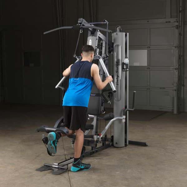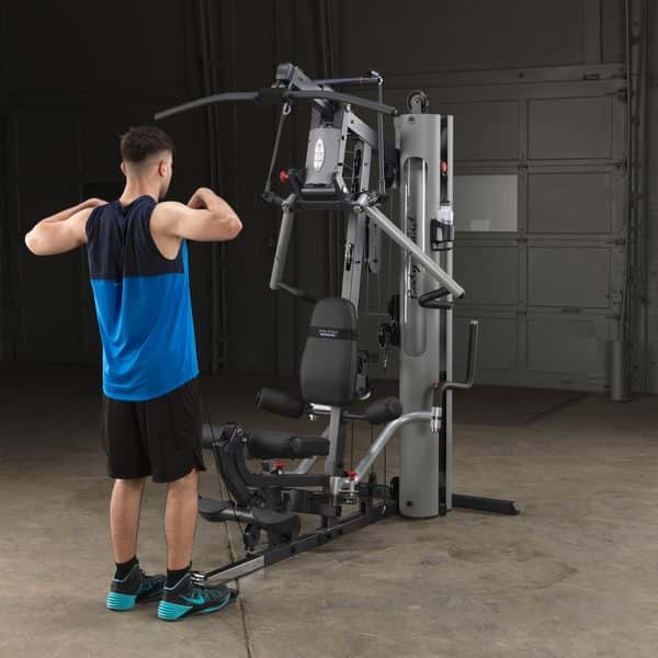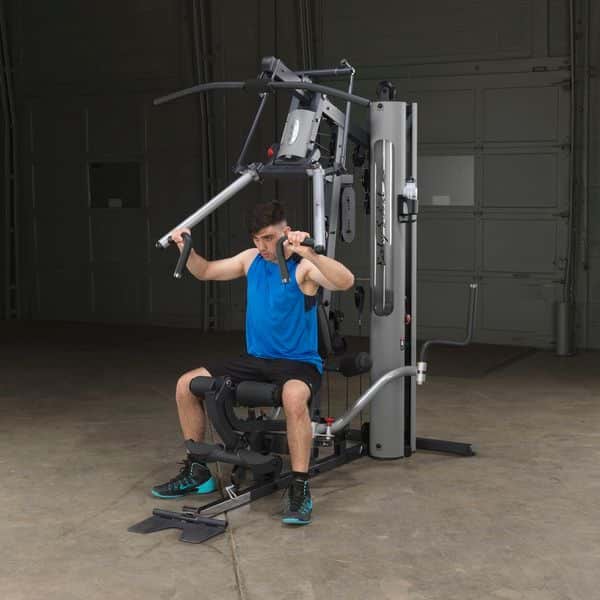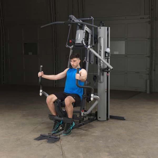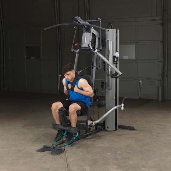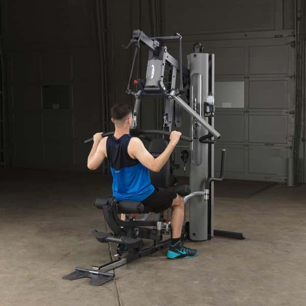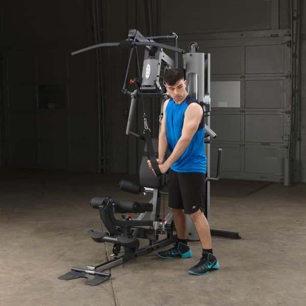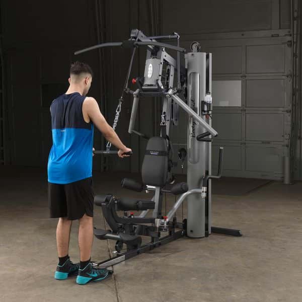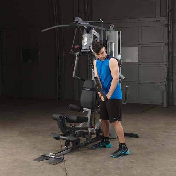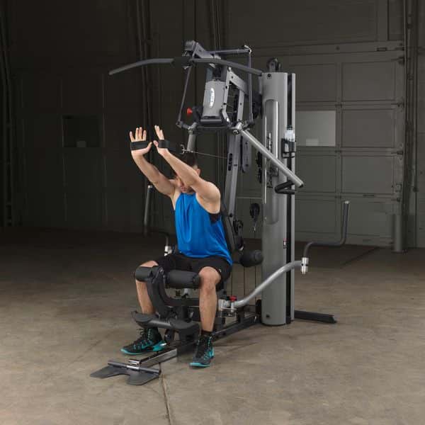 Im Gegensatz zum Body-Solid G-5S werden alle Trainingsübungen am Drückerbügel mit der patentierten Body-Solid Bi-Angular-Technologie durchgeführt. D.h., dass die Hände zum Ende des Bewegungsablaufes zusammengeführt werden, wodurch 25% mehr Muskelkontraktion erzeugt und die Belastung auf die Gelenke reduziert wird. Der Drückerbügel verfügt zudem über 4 unterschiedliche Einstellmöglichkeiten sowie Multipositionsgriffe, die die Muskelkontraktion bei Brust-, Schrägbank- und Schulterübungen noch weiter erhöht. Die selbstausrichtenden, anatomisch geformten Beinstrecker-Polster passen sich automatisch dem Bewegungsablauf an, sodass ein präzises Training des Beinstreckers ermöglicht wird. Ruderübungen werden auf dem Boden sitzend durchgeführt. Dabei wird die vorne am Gerät vorhandene Fußstütze aufgerichtet, um so die nötige Stabilität während der Übung zu erhalten. Die Butterfly-Station verfügt über mehrere Startpositionen, wodurch ein extrem effektives Training der Brustmuskulatur möglich ist. Alle Einstellmöglichkeiten des Ganzkörpertrainers lassen sich per Pop-Pin verstellen, wodurch ein schneller und einfacher Wechseln zwischen den Übungen gewährleistet wird. Darüber hinaus kann das Home-Gym dank des teleskopierbaren sowie im Neigungswinkel verstellbaren Rückenpolsters und dem gasdruckunterstützem Teleskopsitzes optimal auf jede Trainingsposition eingestellt werden. Kugelgelagerte Umlenkrollen, ein nylonummanteltes Stahlseil aus dem Flugzeugbau sowie Gewichtsplatten mit Nylonbuchsen garantieren einen sehr leisen und vor allem ruhigen und friktionsfreien Bewegungsablauf.