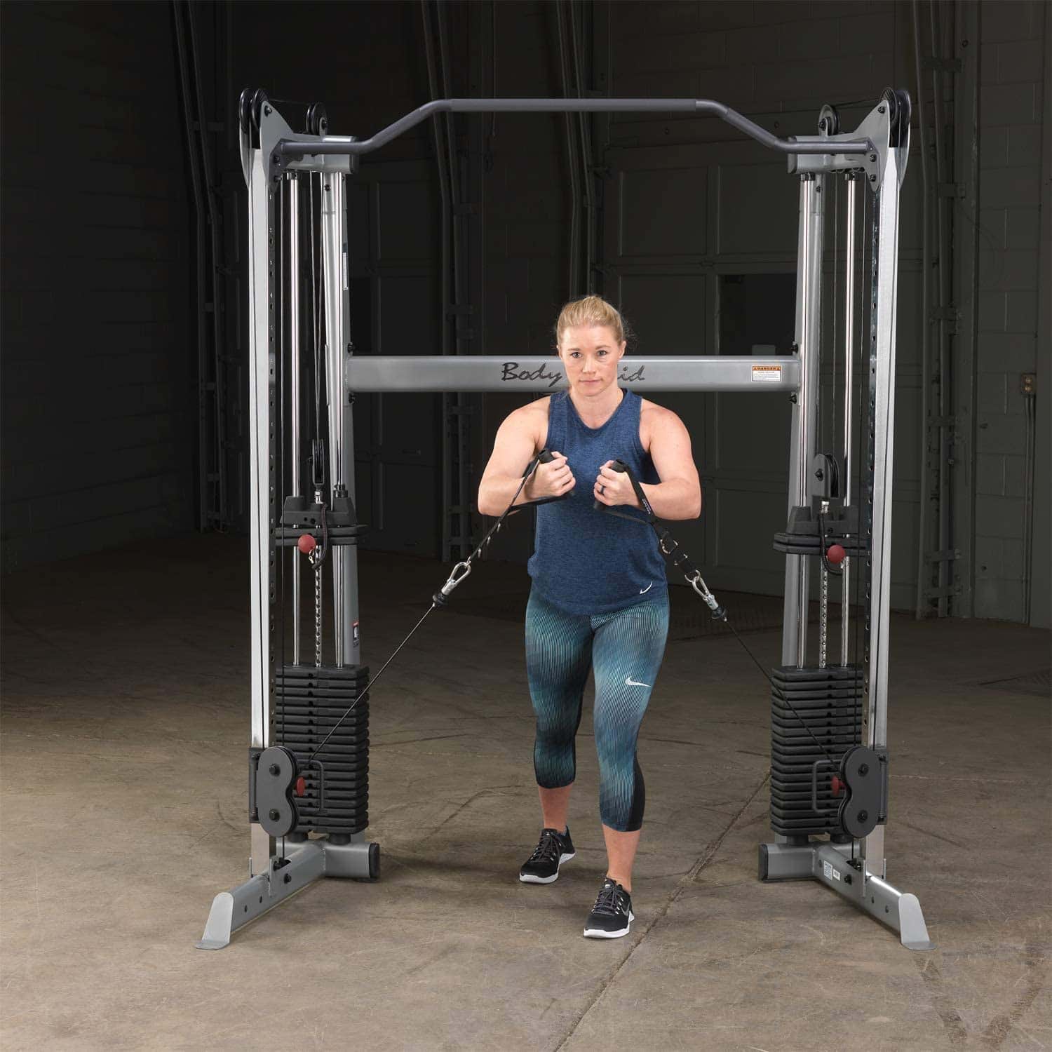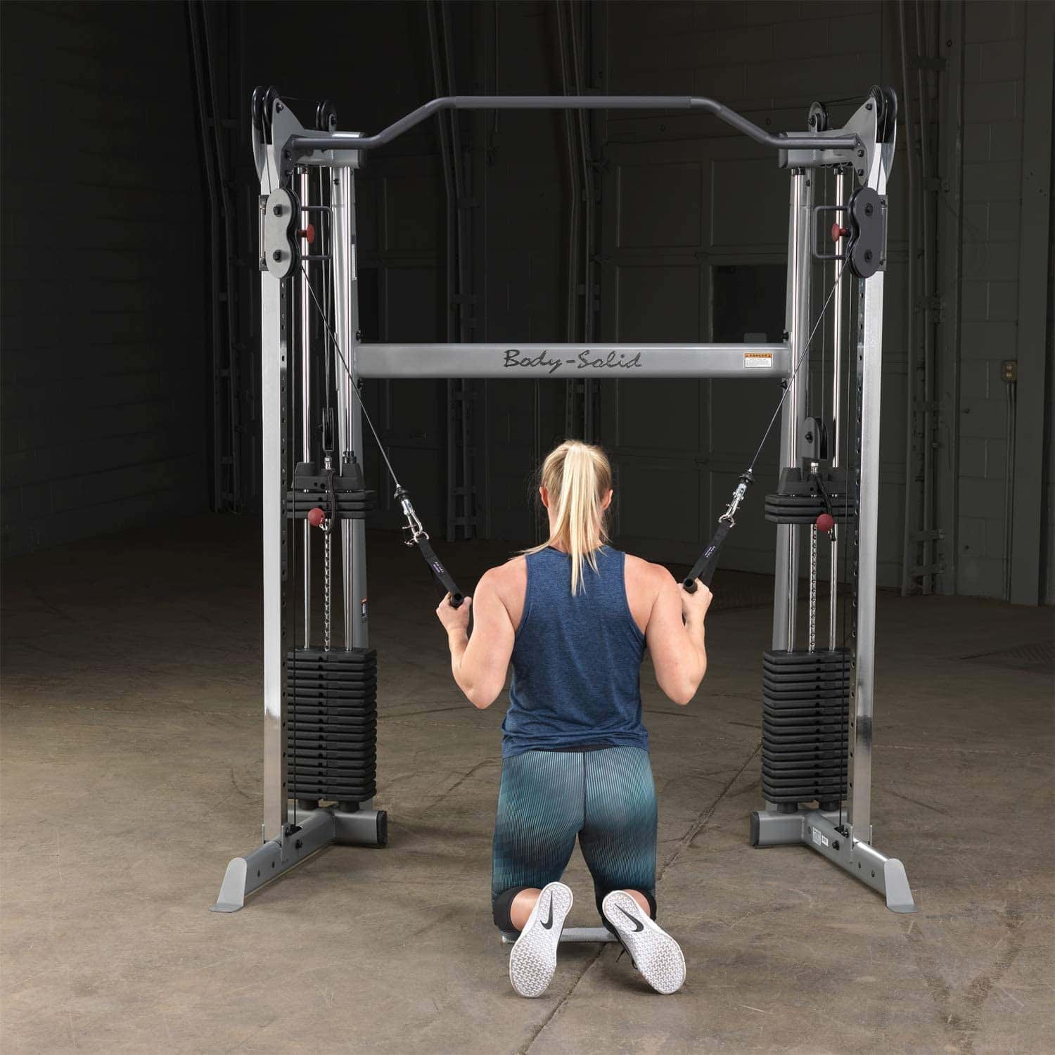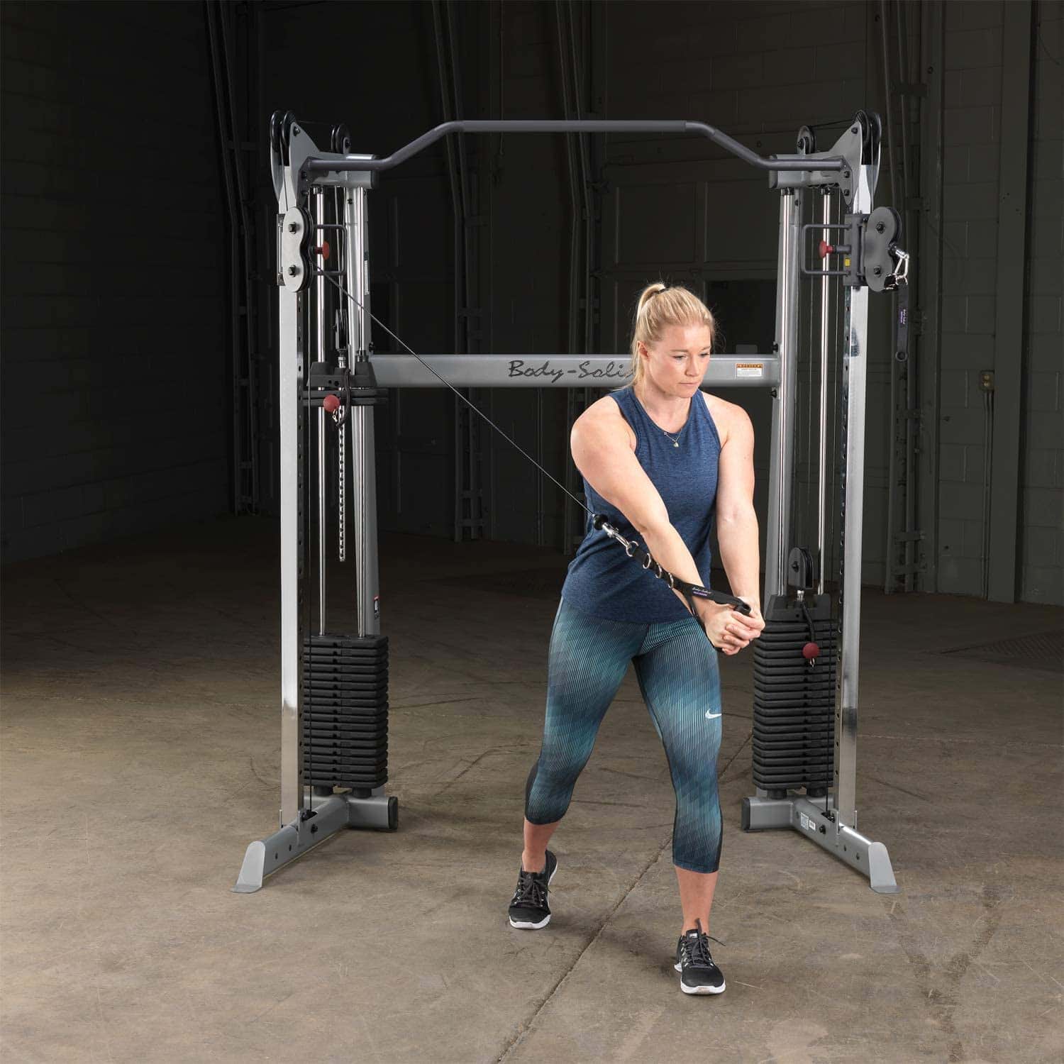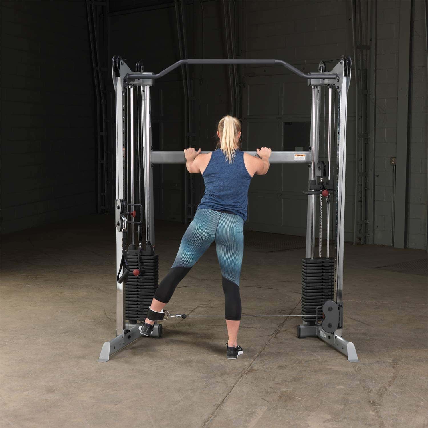 Mit seinem platzsparenden Design, zwei unabhängigen Gewichtsblöcken, "Easy-Click"-Verstellungen sowie präzisionsgefertigten Komponenten ist der GDCC-200 Multi-Kabelzug eine Bereicherung für jeden Trainingsraum. Unabhängig vom Fitness-Level können alle wichtigen Muskelgruppen trainiert werden, um so Ihre Balance, Koordination sowie Körperstabilität zu verbessern. Das Functional Training Center verfügt ab Werk über zwei 72kg-Gewichtsblöcke, die auch nachträglich auf 95kg erhöht werden können. Kugelgelagerte Umlenkrollen sowie ein nylonbeschichtetes Stahlseil aus dem Flugzeugbau reduzieren die Reibungskräfte auf ein Minimum und gewährleisten dadurch ein friktionsfreies Training mit konstanter Zugspannung. Der jeweils 19-fach höhenverstellbare Schlitten lässt sich im Gegensatz zum Body-Solid GCCO-150 durch den zusätzlich angebrachten Bügel einhändig bedienen, wodurch Sie diesen schnell und einfach auf jede gewünschte Position einstellen können. Mit der optional erhältlichen GDCC-BAR können Sie zudem beide Gewichtstürme miteinander verbinden, sodass Kniebeugen, Ausfallschritte u.v.m. durchgeführt werden können.