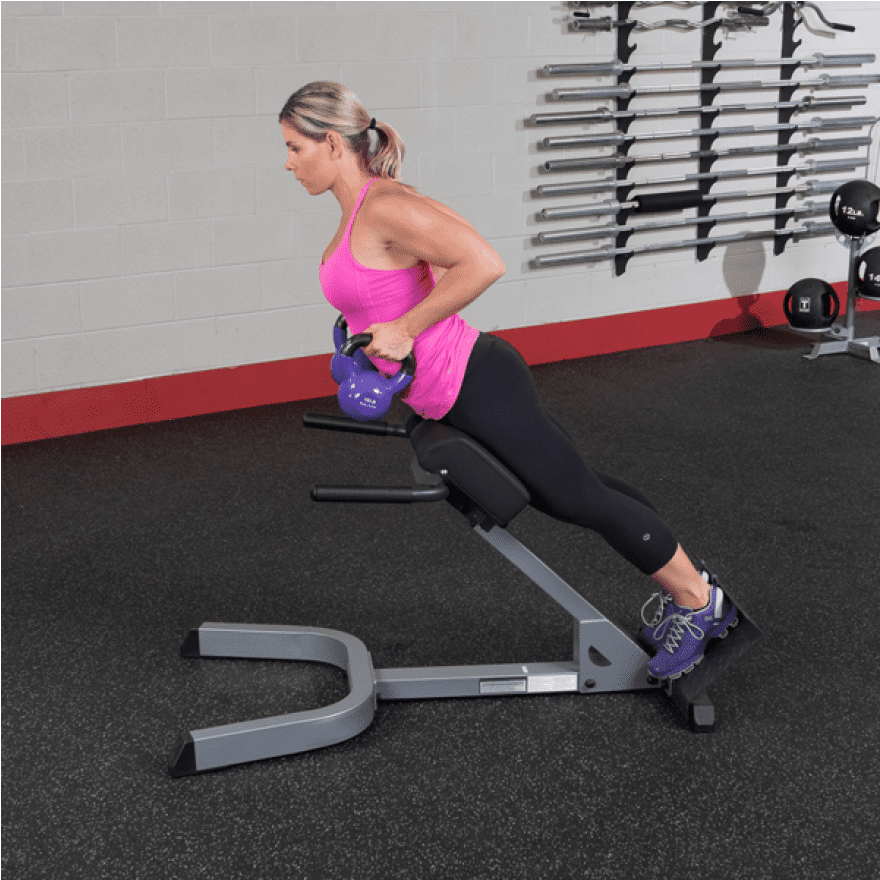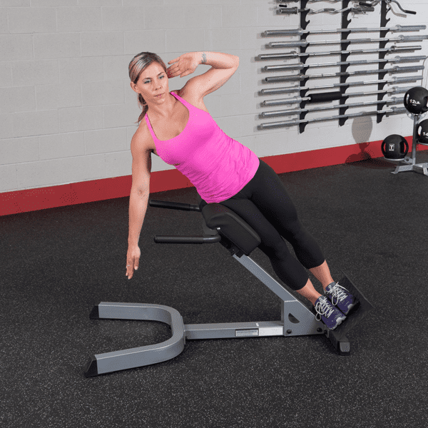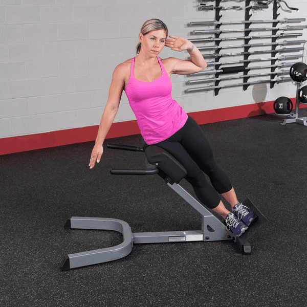 Eine schwache untere Rückenmuskulatur ist häufig der Grund für Haltungsprobleme, wobei starke Belastungen bei einer schwachen Rückenmuskulatur häufig auch die Ursache für Rückenschmerzen sind. Mit dem Body-Solid GHYP-345 können Sie Ihre Rücken-, Gesäß- und Bauchmuskulatur an nur einem Gerät trainieren. Die Gesäßmuskeln werden beansprucht, wenn Ihre Hüfte nach vorn etwas über das Polster hinausragt. In Bauchlage mit auf dem Polster aufliegender Hüfte, wird der untere Rückenstrecker trainiert, der für die allgemeine Körperhaltung zuständig ist. Für ein Training der seitlichen Bauchmuskeln positionieren Sie sich seitlich liegend auf dem Gerät. Dank dem 12-fach höhenverstellbaren Auflagepolster mit zwei Haltegriffen, welches eine optimale Einstellung und somit eine ideale Trainingsposition ermöglicht, kann der Body-Solid Rückenstrecker 45° auf jede Benutzergröße angepasst werden. Eine robuste 5x7,5cm, 4-seitig geschweißte Stahlrahmen-Konstruktion, eine extrem stabile Bodenplatte für einen festen Stand sowie extra starke, hochwertige DuraFirm-Polster mit reißfester Doppelnaht gewährleisten dabei eine sichere und vor allem extrem stabile Trainingseinheit.