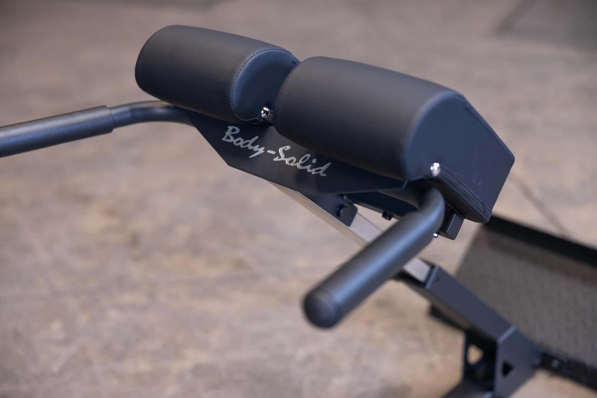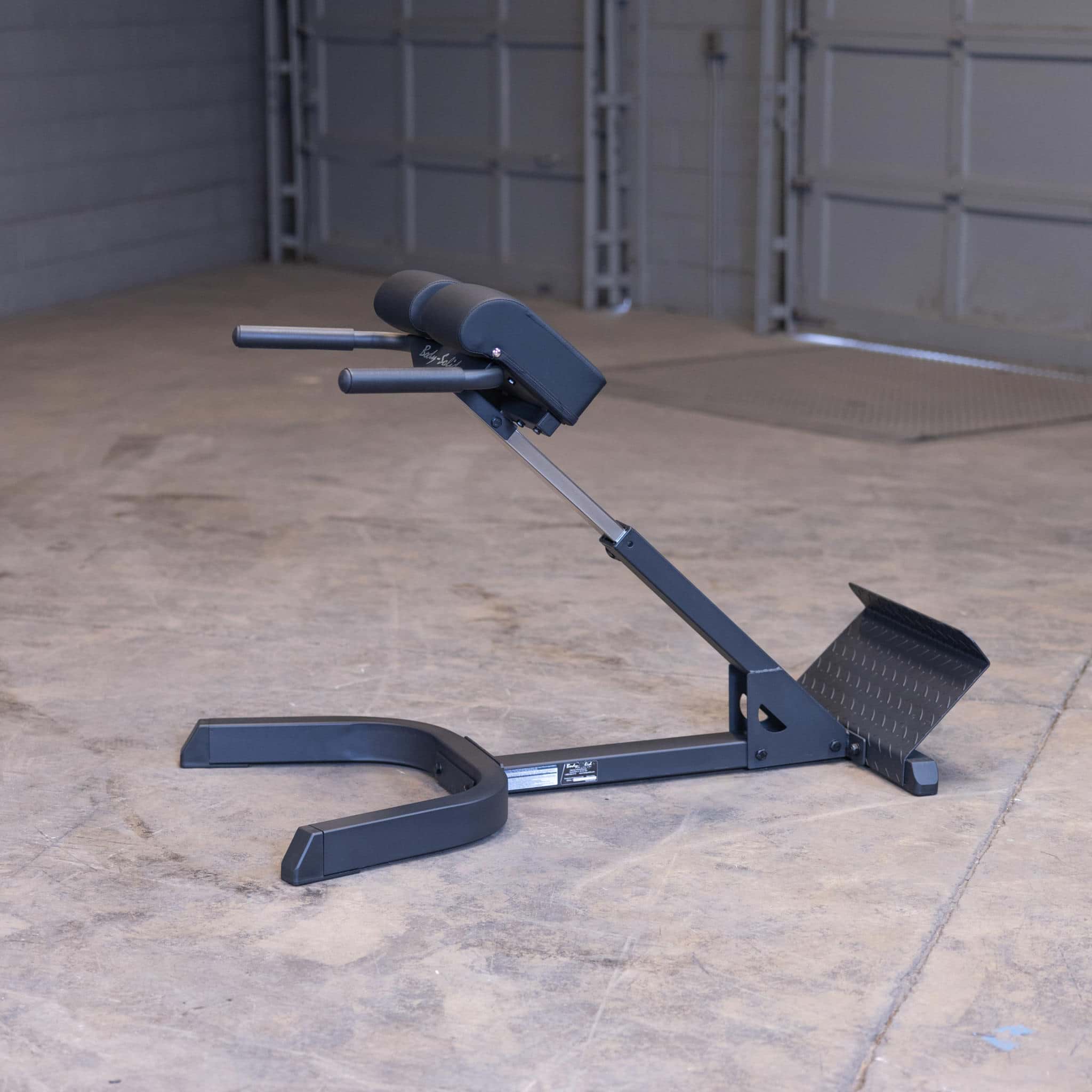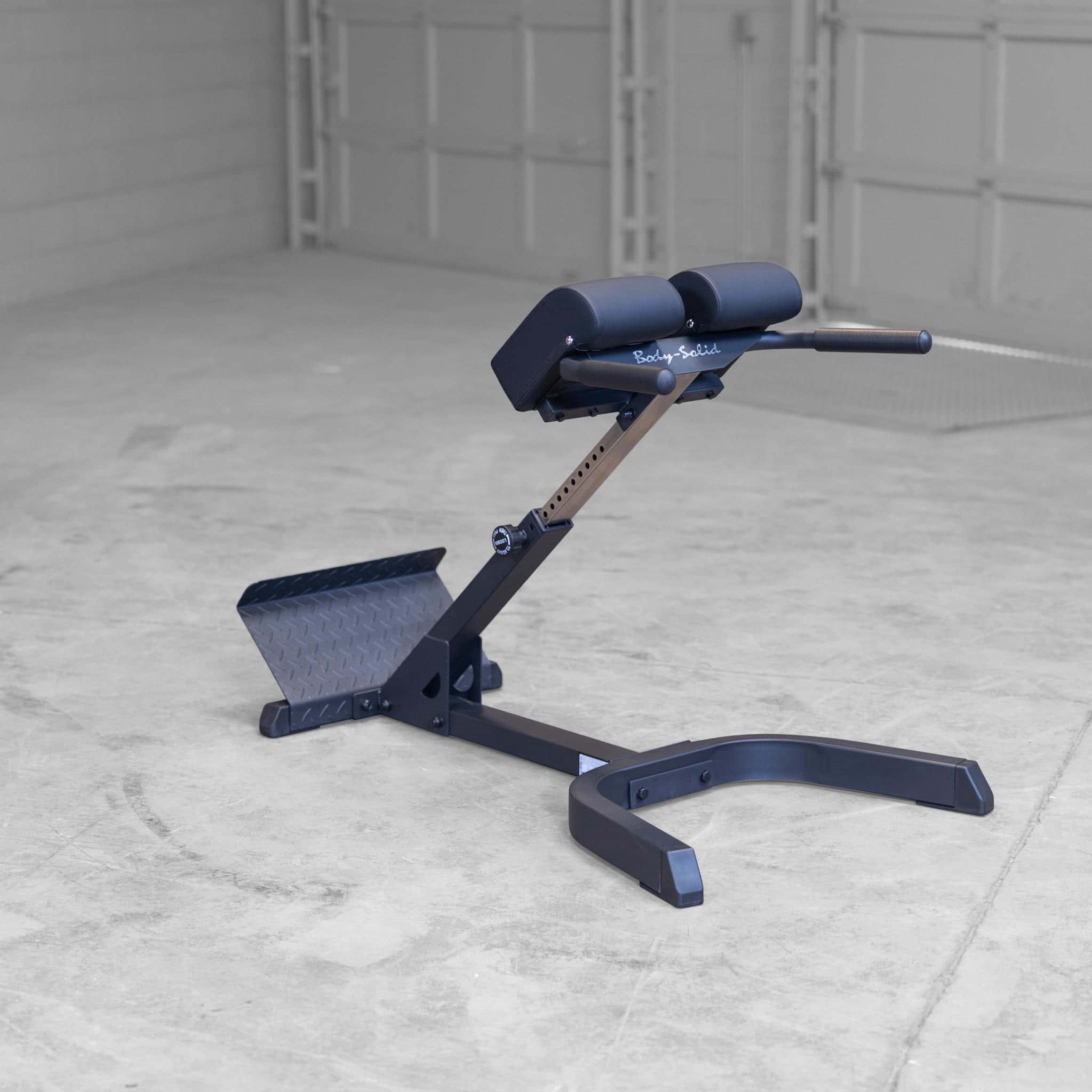 Eine schwache untere Rückenmuskulatur ist häufig der Grund für Haltungsprobleme, wobei starke Belastungen bei einer schwachen Rückenmuskulatur häufig auch die Ursache für Rückenschmerzen sind. Mit dem Body-Solid GHYP-345 können Sie Ihre Rücken-, Gesäß- und Bauchmuskulatur an nur einem Gerät trainieren. Die Gesäßmuskeln werden beansprucht, wenn Ihre Hüfte nach vorn etwas über das Polster hinausragt. In Bauchlage mit auf dem Polster aufliegender Hüfte, wird der untere Rückenstrecker trainiert, der für die allgemeine Körperhaltung zuständig ist. Für ein Training der seitlichen Bauchmuskeln positionieren Sie sich seitlich liegend auf dem Gerät. Dank dem 12-fach höhenverstellbaren Auflagepolster mit zwei Haltegriffen, welches eine optimale Einstellung und somit eine ideale Trainingsposition ermöglicht, kann der Body-Solid Rückenstrecker 45° auf jede Benutzergröße angepasst werden. Eine robuste 5x7,5cm, 4-seitig geschweißte Stahlrahmen-Konstruktion, eine extrem stabile Bodenplatte für einen festen Stand sowie extra starke, hochwertige DuraFirm-Polster mit reißfester Doppelnaht gewährleisten dabei eine sichere und vor allem extrem stabile Trainingseinheit.