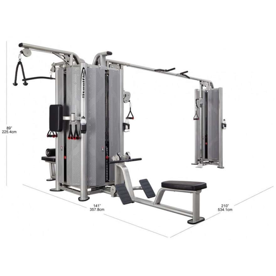 Der 5-Stationen-Turm von Steelflex besteht aus dem Jungle-Gym JG4000S, der Erweiterung JG1000 sowie der Verbindungsstrebe JGMB. Das JG1000 wird mit der Verbindungsstrebe an der höhenverstellbaren Kabelzugstation des JG4000S montiert, wodurch ein Cable-Crossover mit einer Klimmzug-Vorrichtung entsteht. Beide Kabelzugstationen können dabei auch separat benutzt werden, sodass bis zu 5 Personen gleichzeitig und unabhängig Ihres Fitnesslevels trainieren können. Jede der 5 Stationen verfügt zudem über einem eigenen 210lbs-Steckgewichtblock [95kg] aus kohlenstoffarmem Stahl für Rostschutz, weniger Lärm und dauerhaften Betrieb.