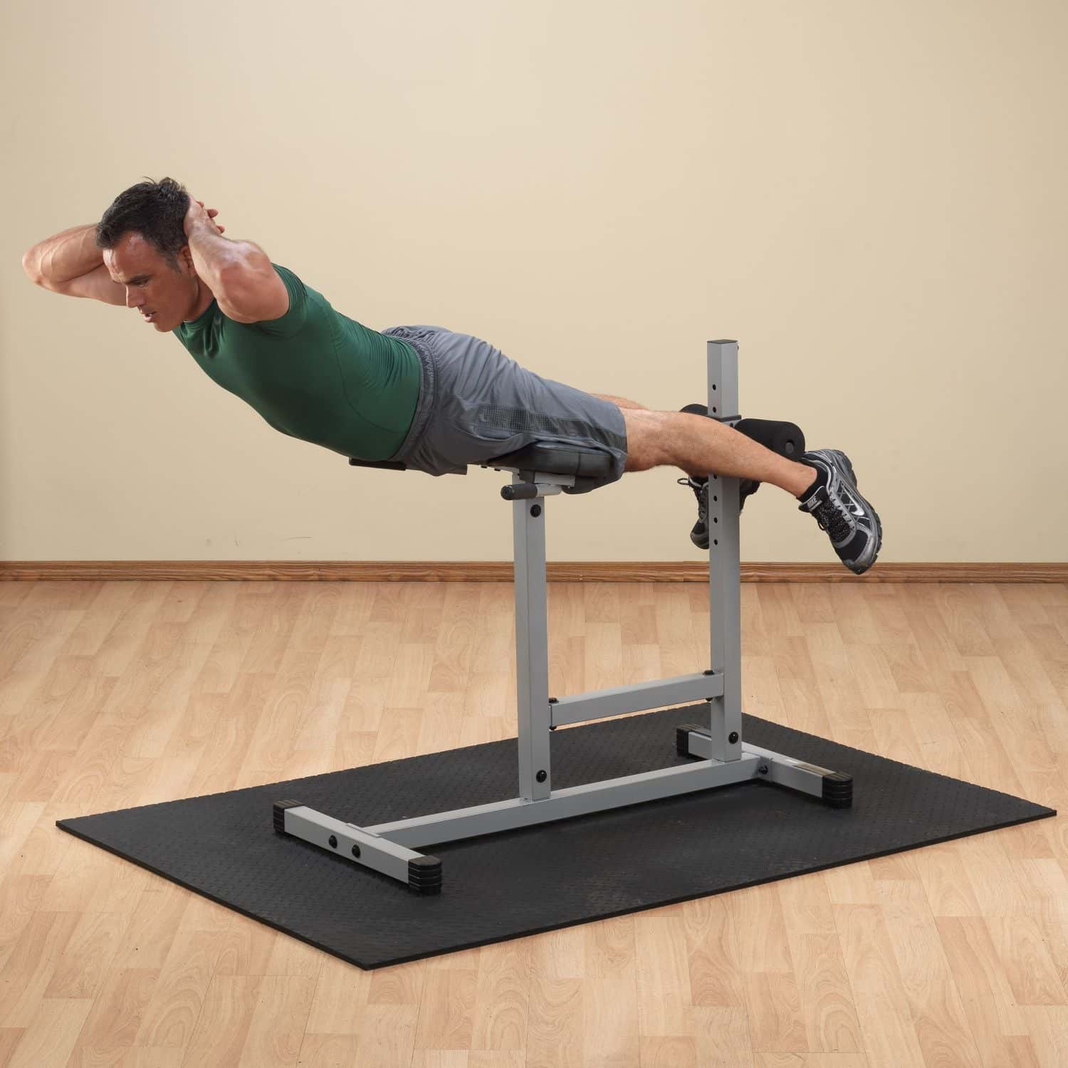 Der Body-Solid Rückenstrecker aus der Powerline-Serie ist das perfekte Einsteigermodell, um Ihre untere Rückenmuskulatur sowie die gesamte Bauch- sowie Gesäßmuskulatur zu trainiert. Die Gesäßmuskeln werden beansprucht, wenn Ihre Hüfte nach vorn etwas über das Polster hinausragt. In Bauchlage, mit auf dem Polster aufliegender Hüfte, wird der untere Rückenstrecker trainiert, der für die allgemeine Körperhaltung zuständig ist. Die obere Bauchmuskulatur kann in Rückenlage auf den Polstern sitzend trainiert werden. Für ein Training der seitlichen Bauchmuskeln positionieren Sie sich seitlich liegend auf dem Gerät. Dank der höhenverstellbaren Schaumpolsterrollen, welche zum einen den Trainingskomfort erhöhen und zum anderen die zahlreichen Trainingspositionen ermöglichen, kann das Gerät auf jede Benutzergröße individuell angepasst werden. Eine robuste 5x5cm Stahlrahmenkonstruktion, die schnelle "Easy-Click"-Verstellung, sowie die bequeme Polsterung garantieren einen angenehmen und vor allem sicheren Trainingsablauf.
