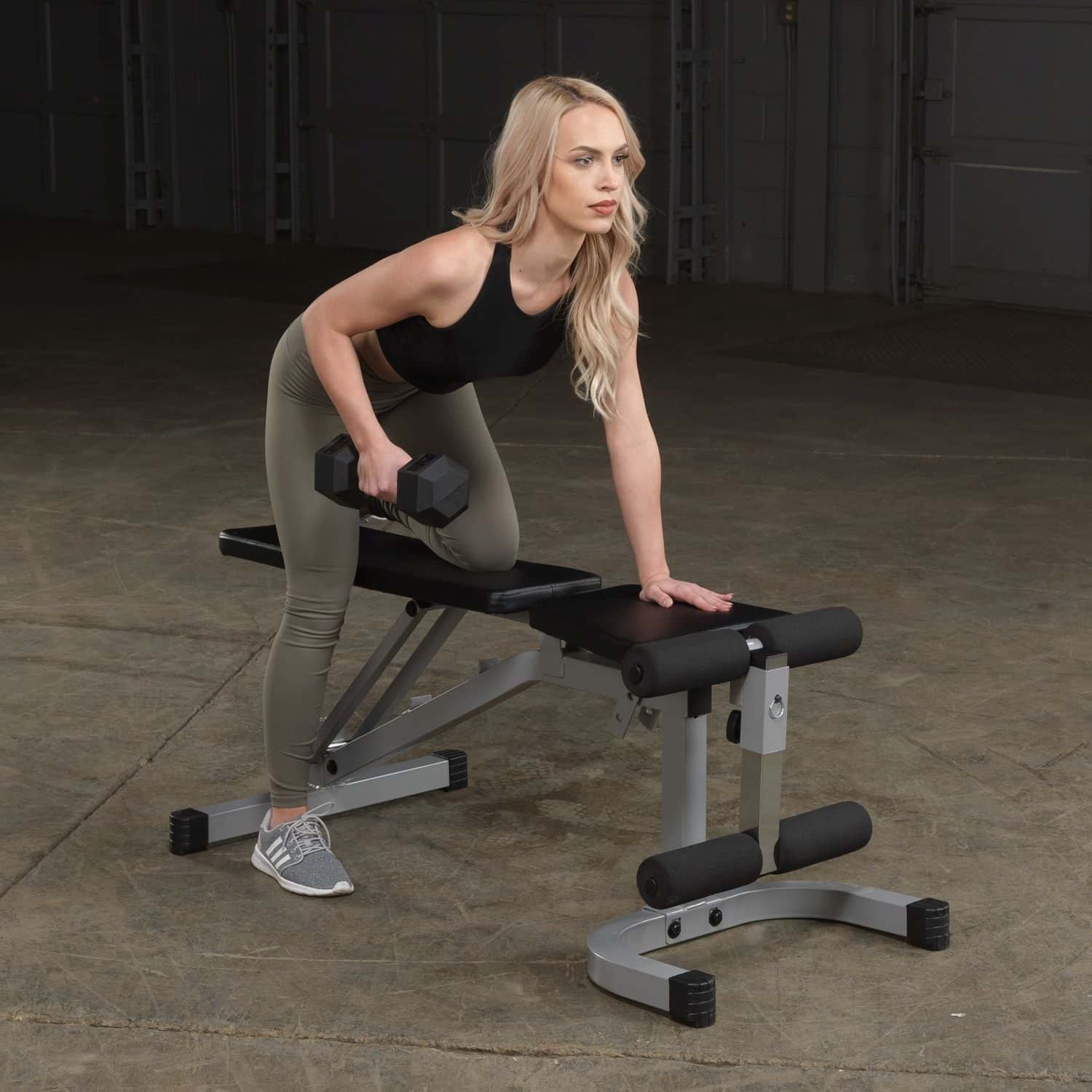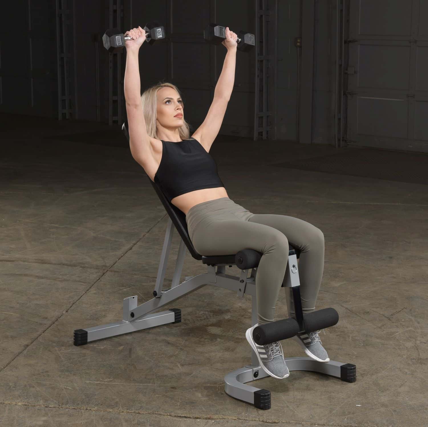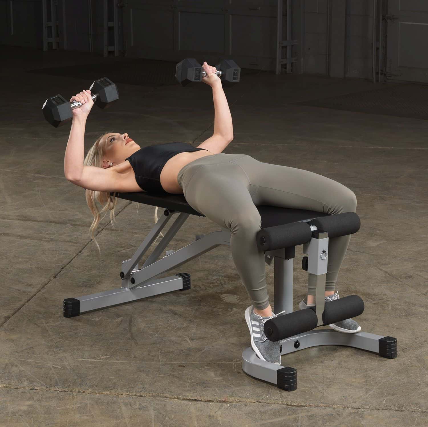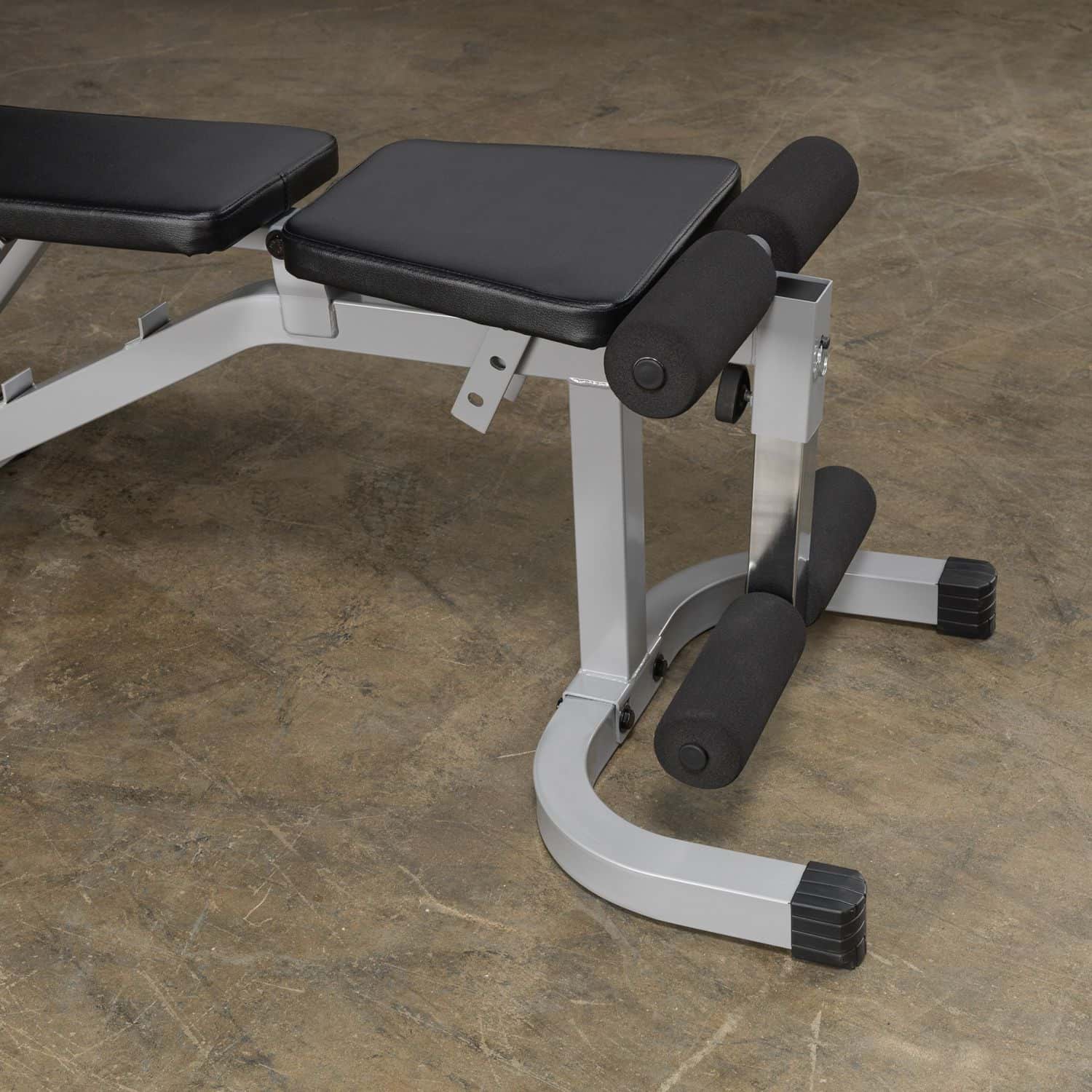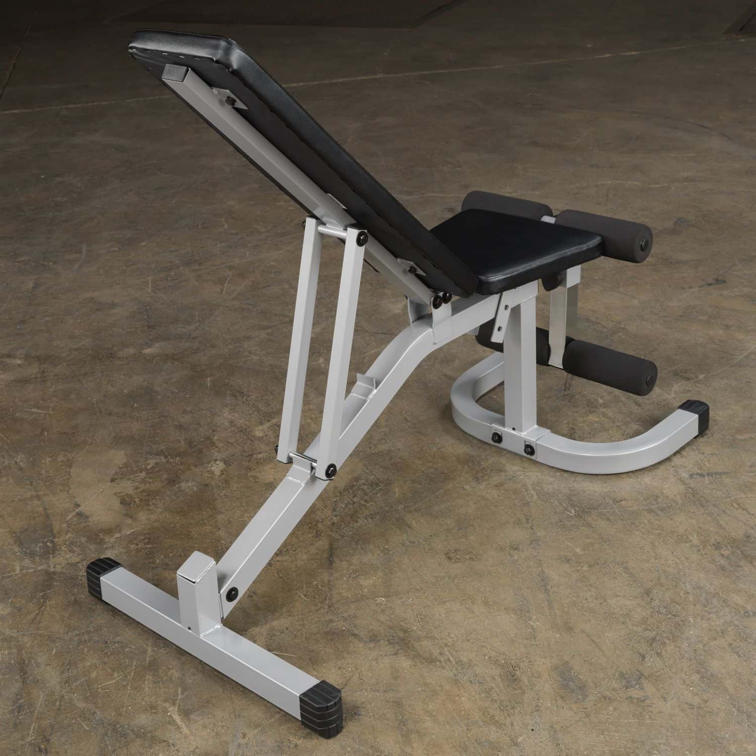 Die Body-Solid Hantelbank aus der Powerline-Serie lässt sich mit nur wenigen Handgriffen zu einer Flachbank, Schrägbank oder Negativbank umbauen. Dank der zusätzlich angebrachten Beinhalterung können auch Sit-ups optimal ausgeführt werden. Dabei sorgen 4 Einstellmöglichkeiten der Rückenlehne sowie 3 Verstellmöglichkeiten des Sitzpolsters für eine gute Trainingspositionierung bei Neigungs- und Schulterdrückübungen. Durch die verschiedenen Einstellmöglichkeiten ist die Kombibank eine gute Ergänzung für Ihr Power-Rack, Ihrer Multipresse oder Smith Machine. Die Kombibank kann zudem mit einen Bein- und/oder Curlpult-Aufsatz erweitert werden. In Verbindung mit diesen Ergänzungen können auch Übungen wie z.B. Scott-Curls, Beinstrecken und Beinbeugen durchgeführt werden.