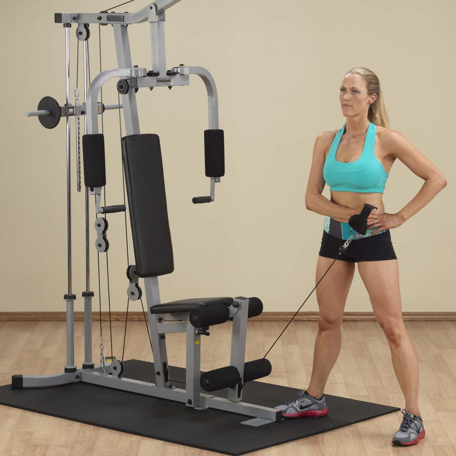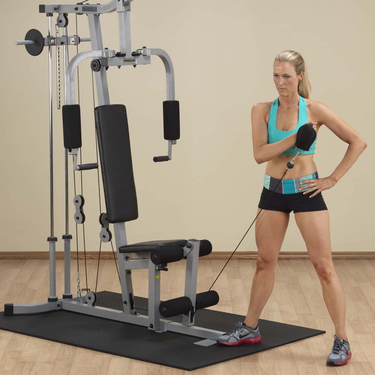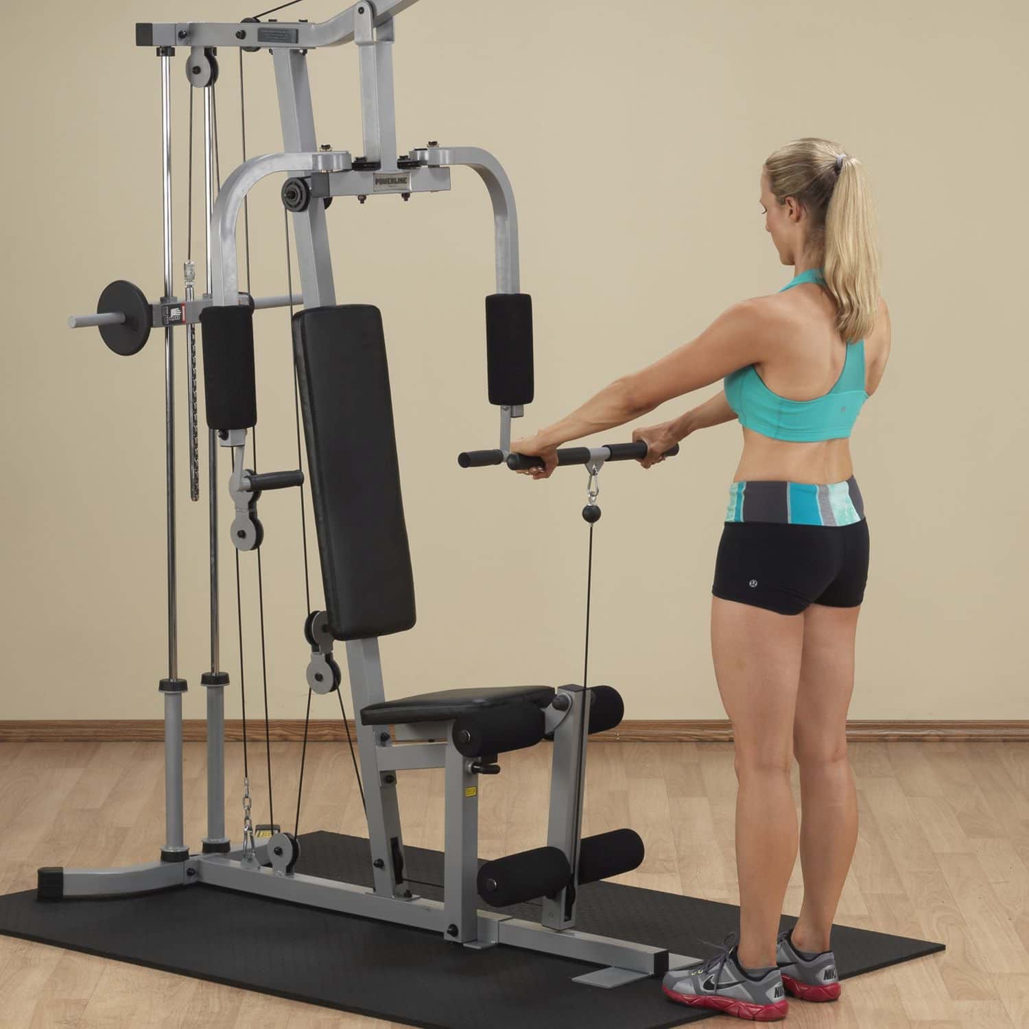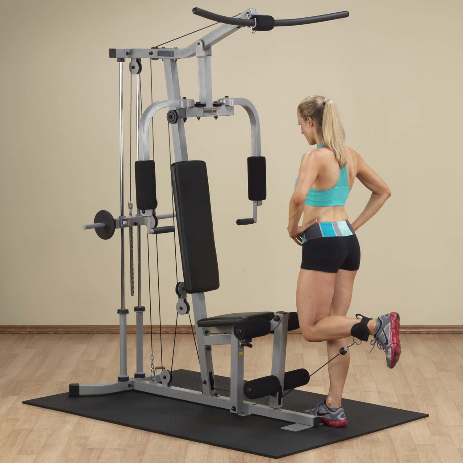 Der Body-Solid Ganzkörpertrainer aus der Powerline-Serie ist das perfekte Einsteigermodell für Ihr Home-Gym. Das PHG-1000X verfügt über zwei Kabelzug-Vorrichtungen (unten und oben am Gerät), einem Bankdrückbügel mit integrierten Butterflyarmen sowie einer Beinstation. Dabei ist ein unmittelbarer Wechsel vom Bankdrücken zum Butterfly möglich, da eine Verstellung des Gerätes für die verschiedenen Übungen nicht erforderlich ist. Die Kraftstation ist für die Nutzung von Hantelscheiben konzipiert worden, kann jedoch aber auch optional mit einem 72kg-Steckgewichtsblock ausgestattet werden, sodass der Trainingswiderstand schnell und einfach eingestellt werden kann. Zusätzlich zu dem Gewichtspaket können zusätzlich auch Hantelscheiben zur Erhöhung des Trainingswiderstandes verwendet werden. Kugelgelagerte Umlenkrollen, ein nylonummanteltes Stahlseil aus dem Flugzeugbau sowie Gewichtsplatten mit Nylonbuchsen garantieren dabei einen friktionsfreien Bewegungsablauf.