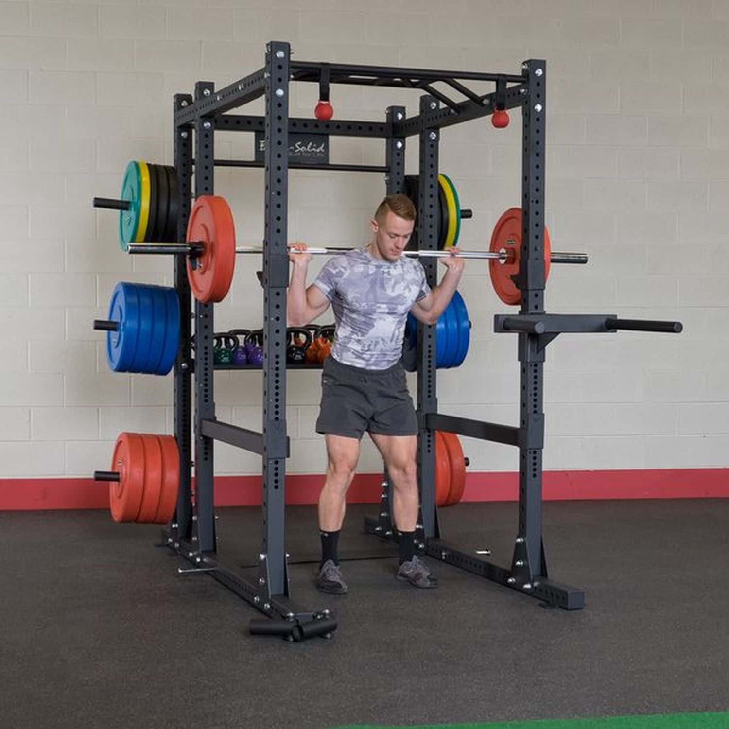 Body-Solid's Power-Rack, das Pro Clubline SPR-1000, bietet alles, was man sich von einem Power-Rack wünschen kann und wurde so konzipiert, dass es den Anforderungen jedes Fitnessstudios bzw. jeder kommerziellen Einrichtung gerecht wird. Die 7,5x7,5cm Stahlrahmenkonstruktion verleiht dem Power-Rack eine hohe Belastbarkeit, wodurch es einem Workout mit hohen Gewichten bis zu 450kg standhält. Das SPR-1000 misst eine Höhe von 229cm und ist damit perfekt für Klimmzüge, stehendes Schulterdrücken und viele andere Übungen geeignet, die auf kürzeren Power-Racks oft nicht möglich sind. Dank des 25,4mm-Lochabstandes kann jeder Trainierende eine optimale Position für die Sicherheitsablagen finden, ohne das der Bewegungsablauf beeinträchtigt wird. Die langen Sicherheitsablagen sowie die kurzen Hantelablagen sind bereits im Lieferumfang der Basisvariante inbegriffen.
